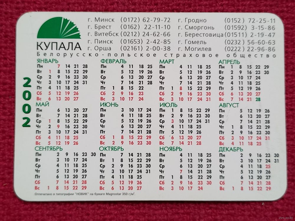 Календарик Купала. Страховое общество. 2002 г.
