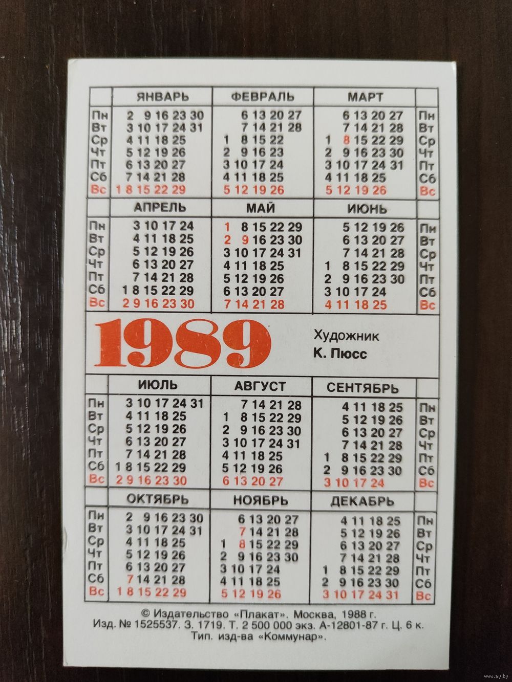 Календарик Плакат 1989г