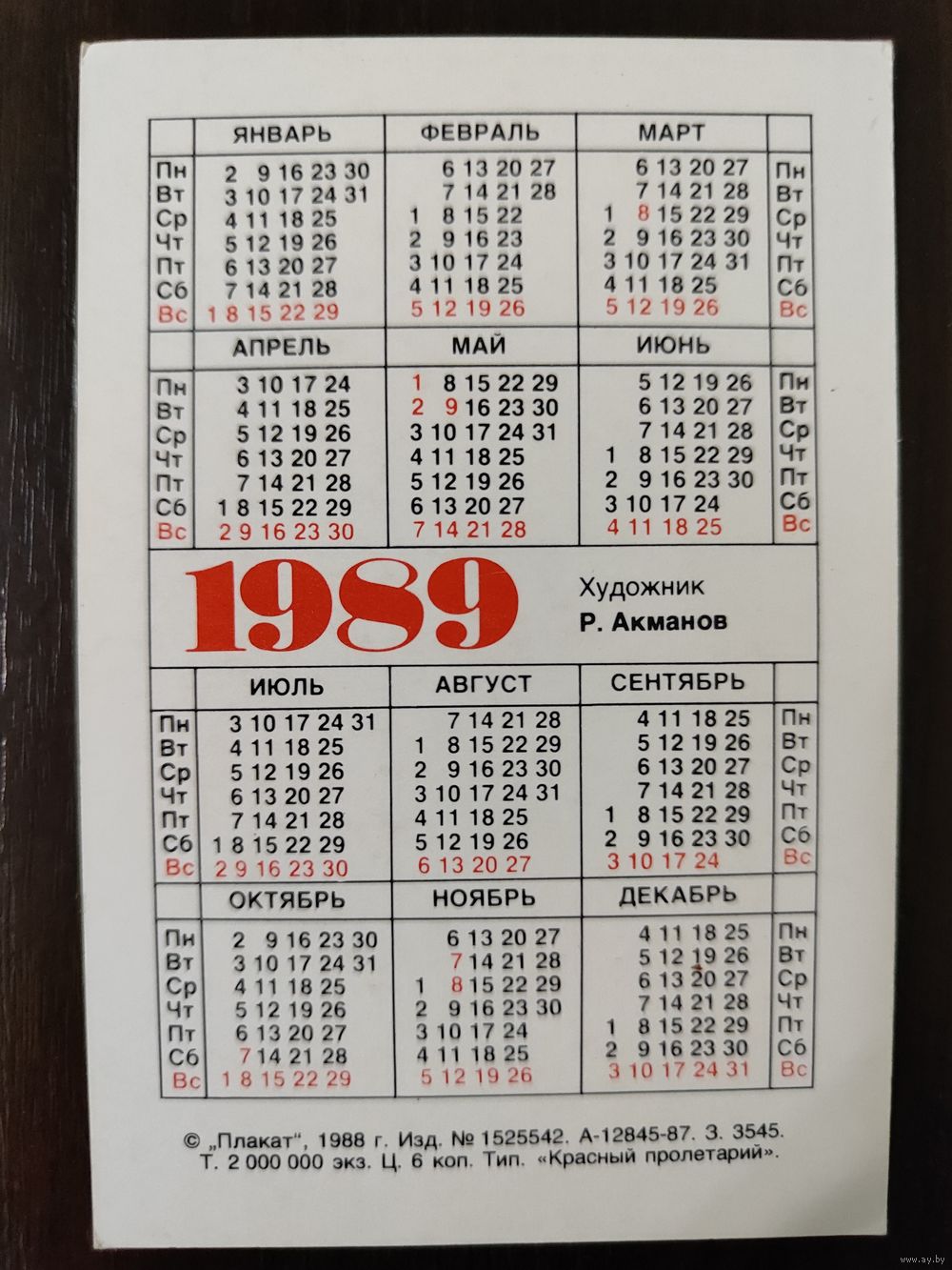 Календарик Плакат 1989г