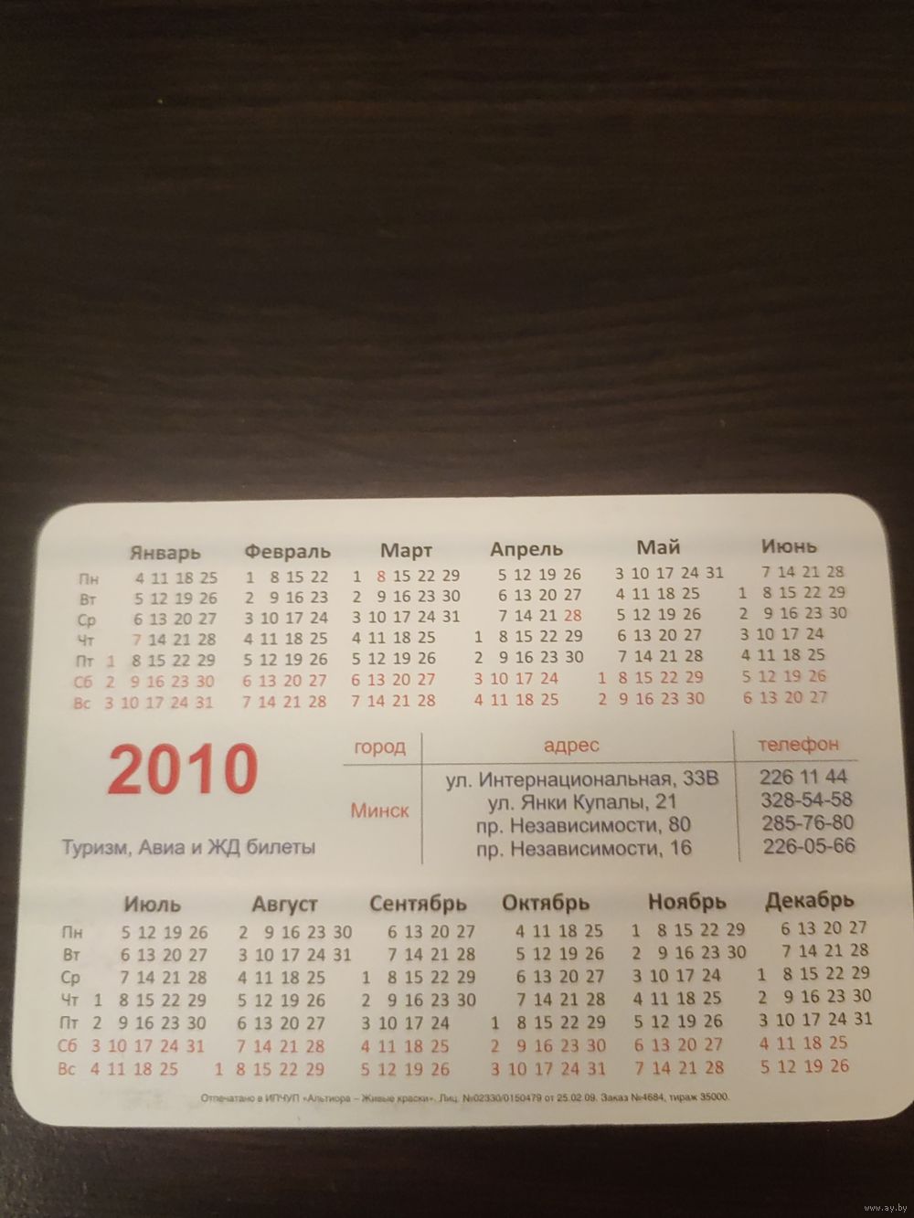 Календарик,реклама,2010