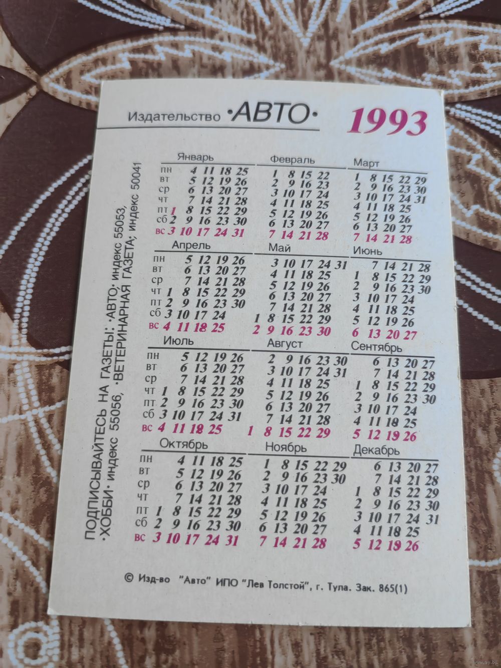Календарик,реклама,пресса,1993