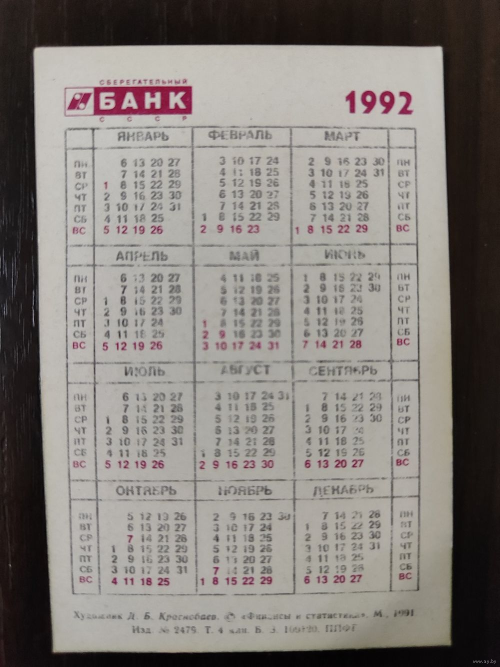 Календарик Сбербанк 1992г