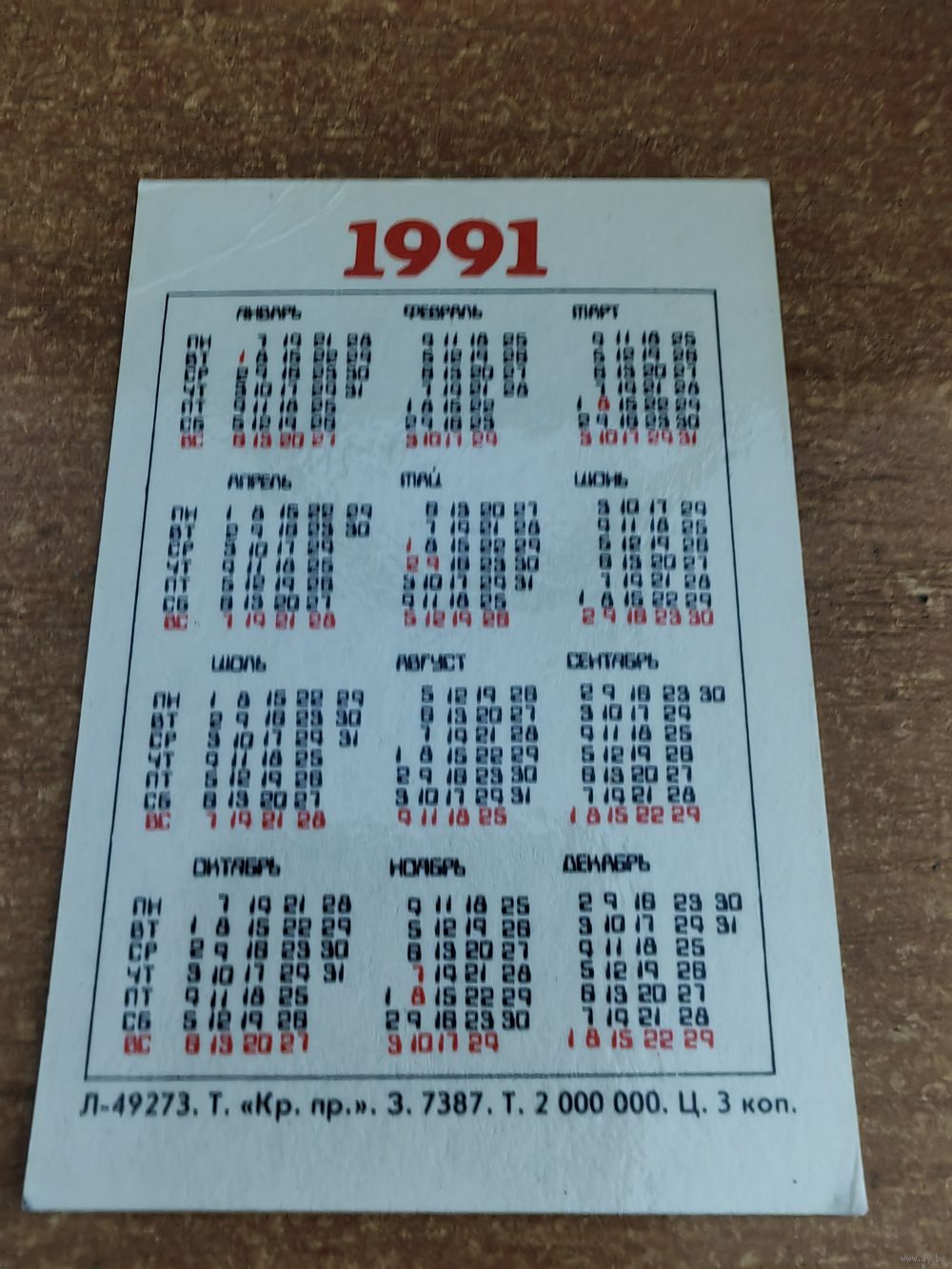 Календарик,ссср,1991
