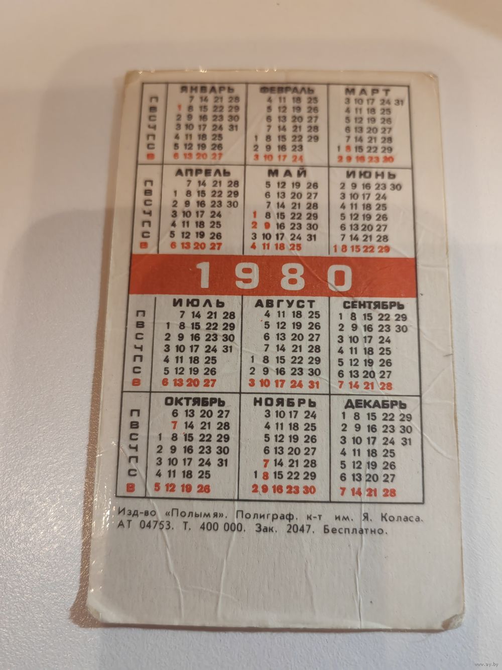 Календарик,страхование,1980