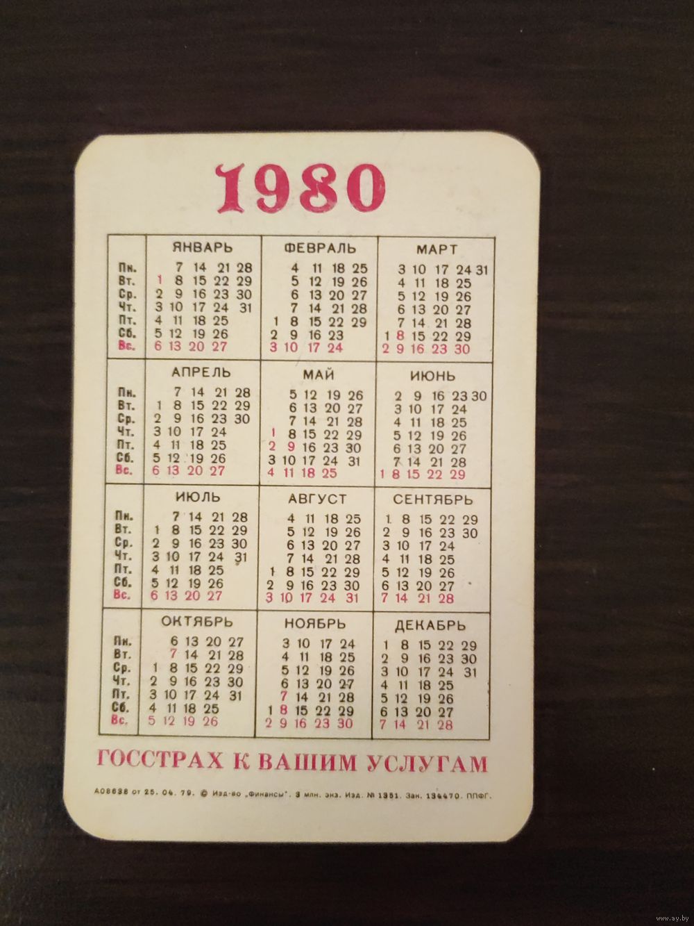 Календарик,страхование,1980