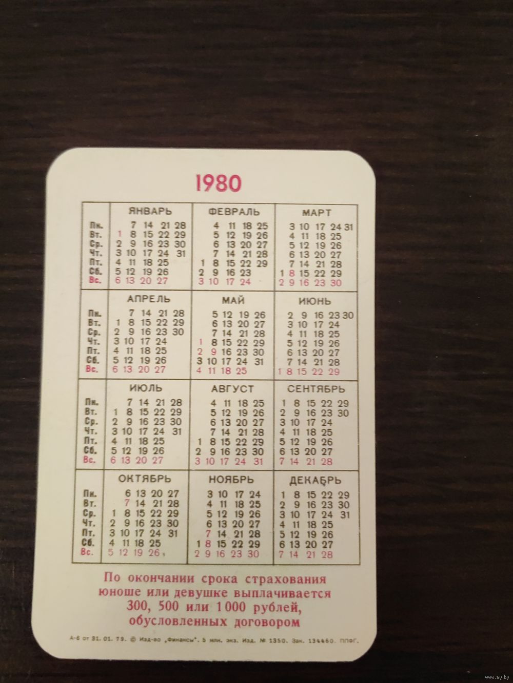 Календарик,страхование,1980