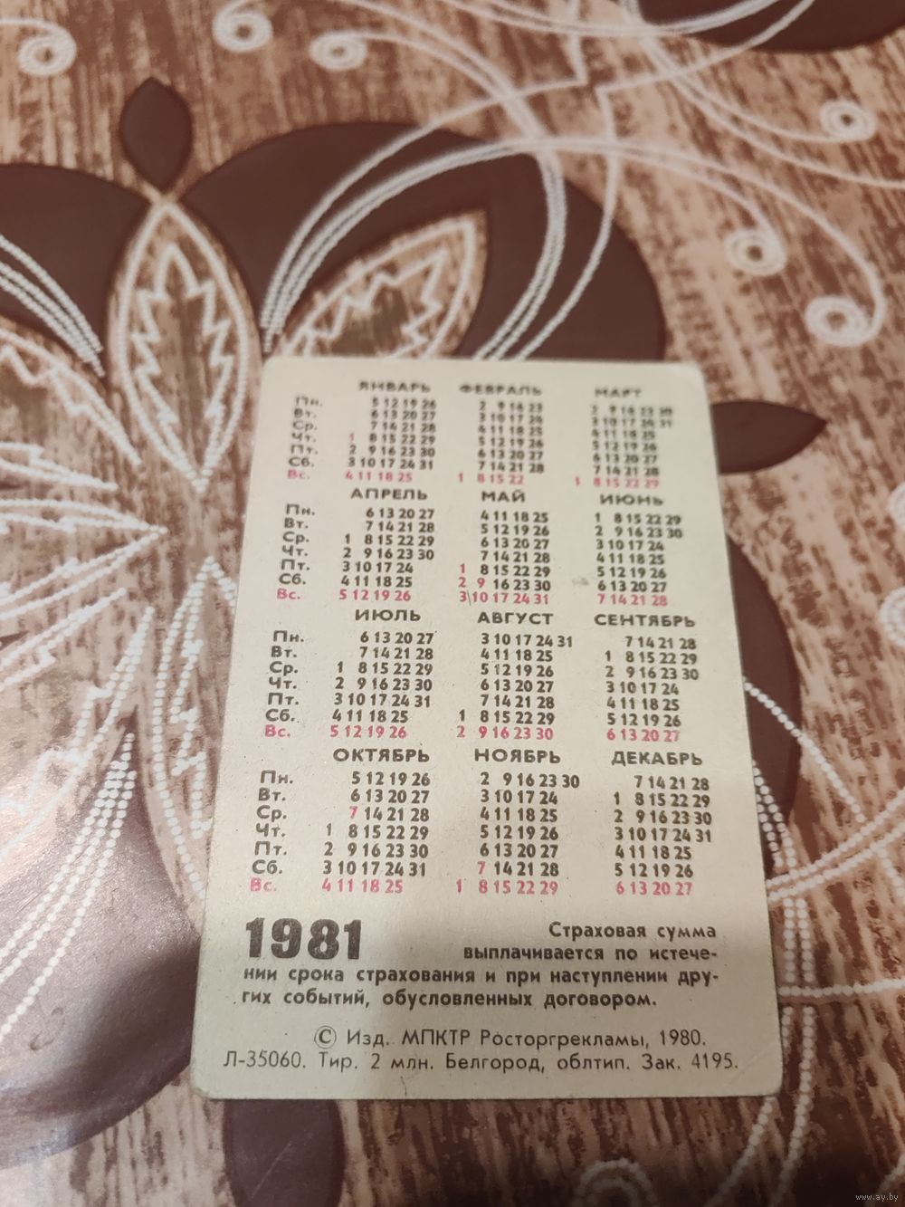 Календарик,страхование,1981