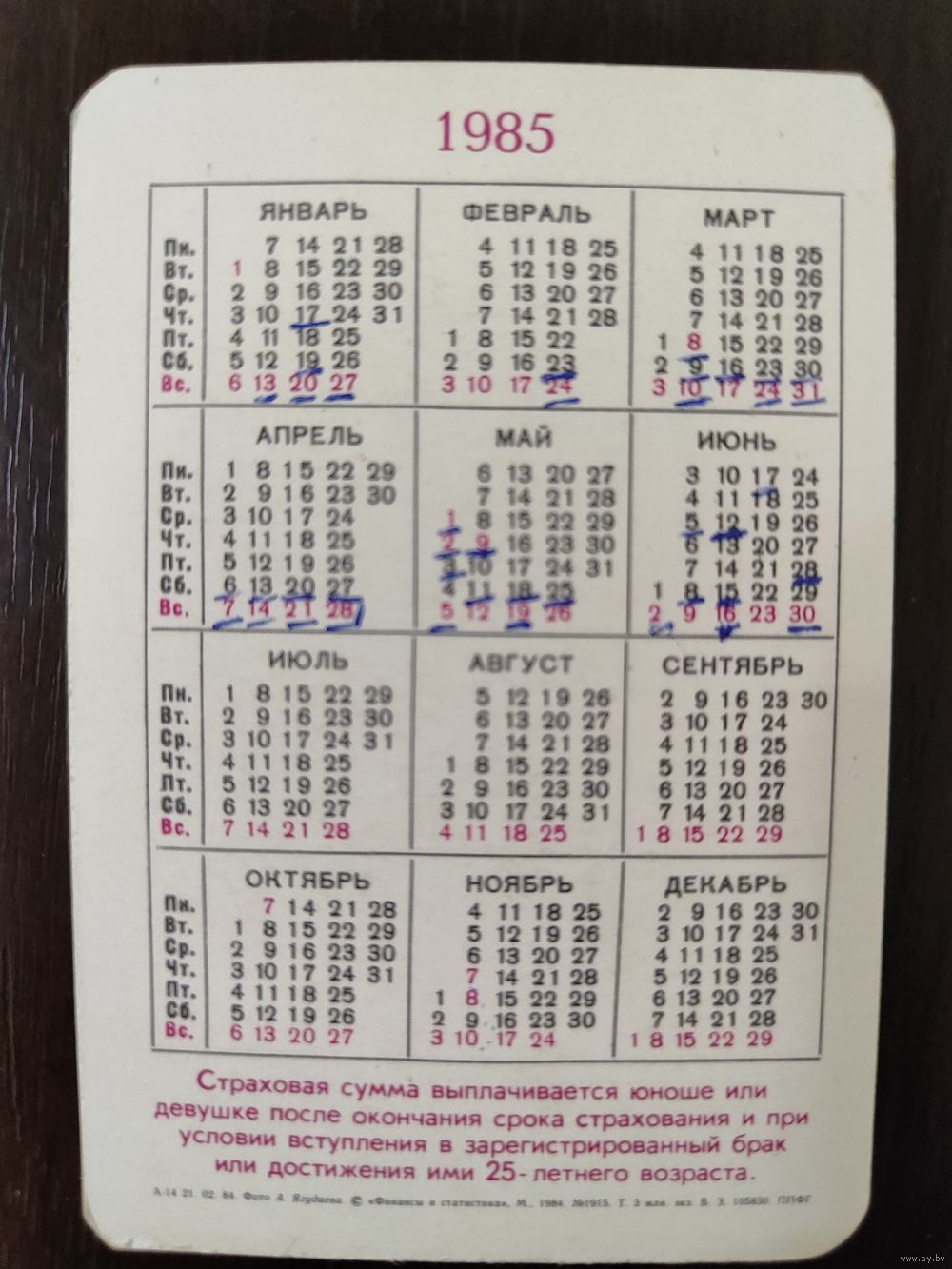 Календарик страхование 1985г