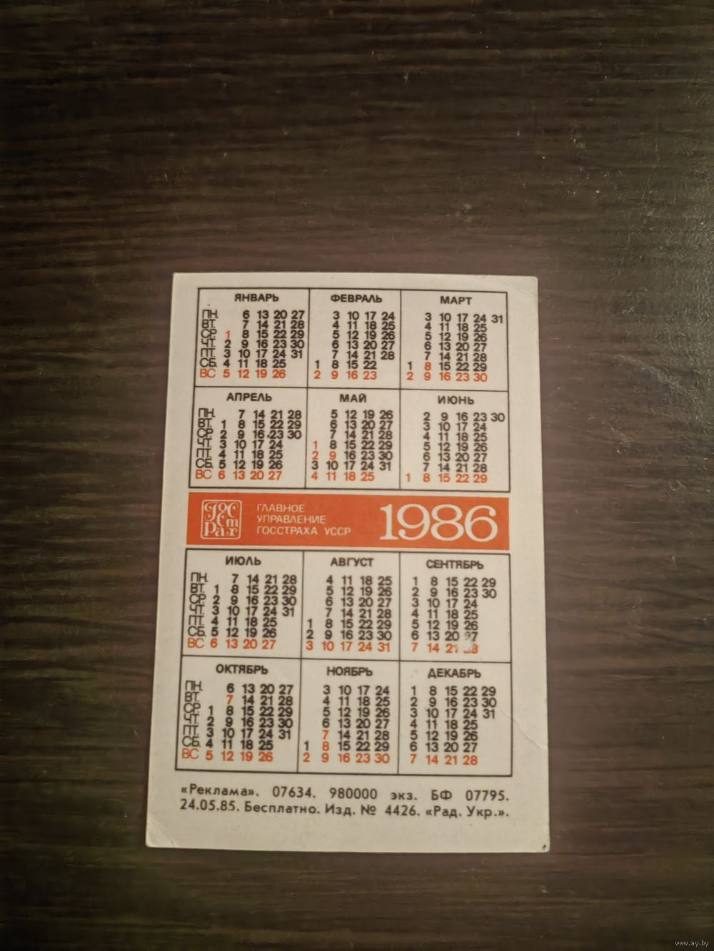 Календарик,страхование,1986