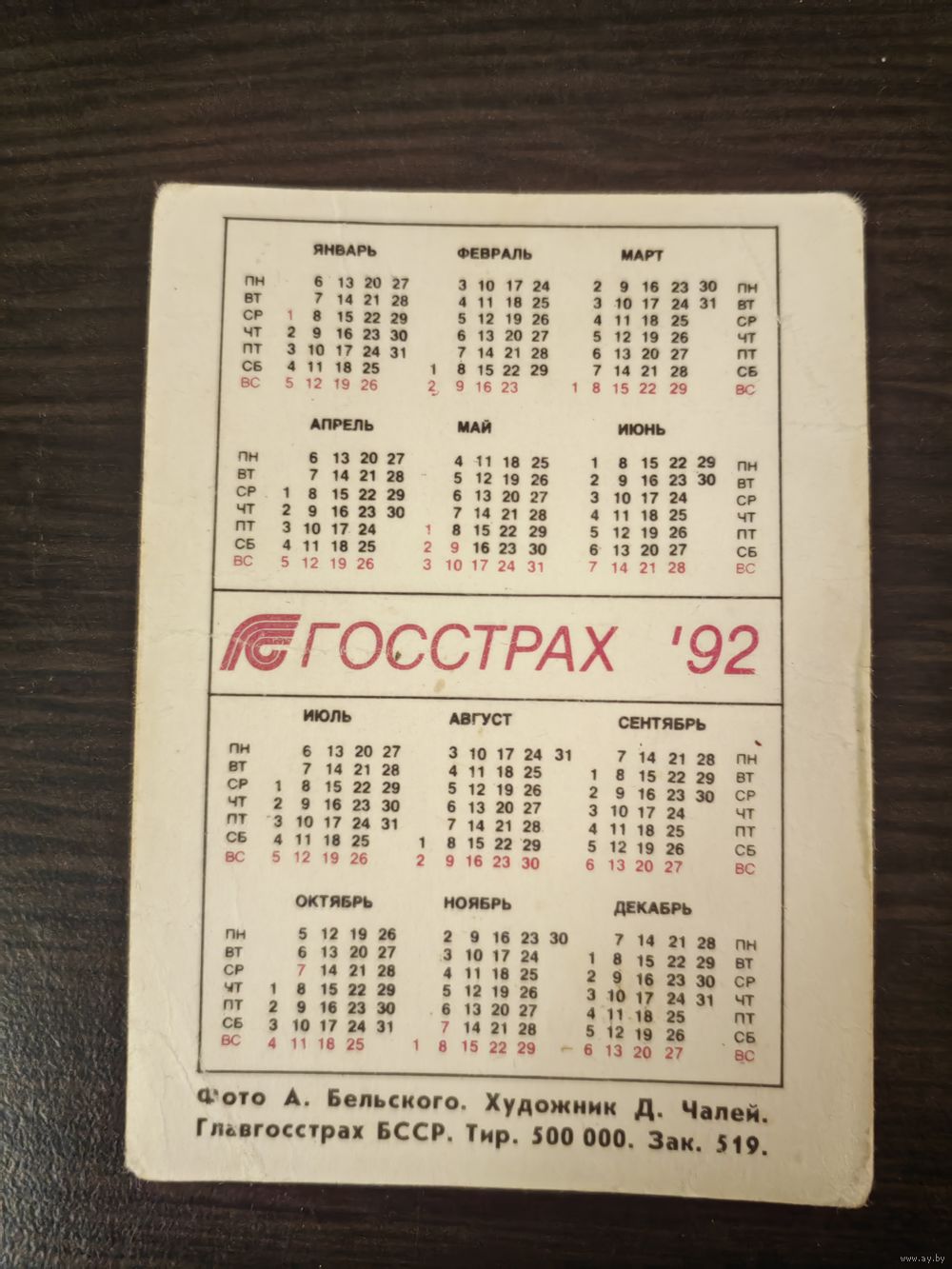 Календарик,страхование,1992