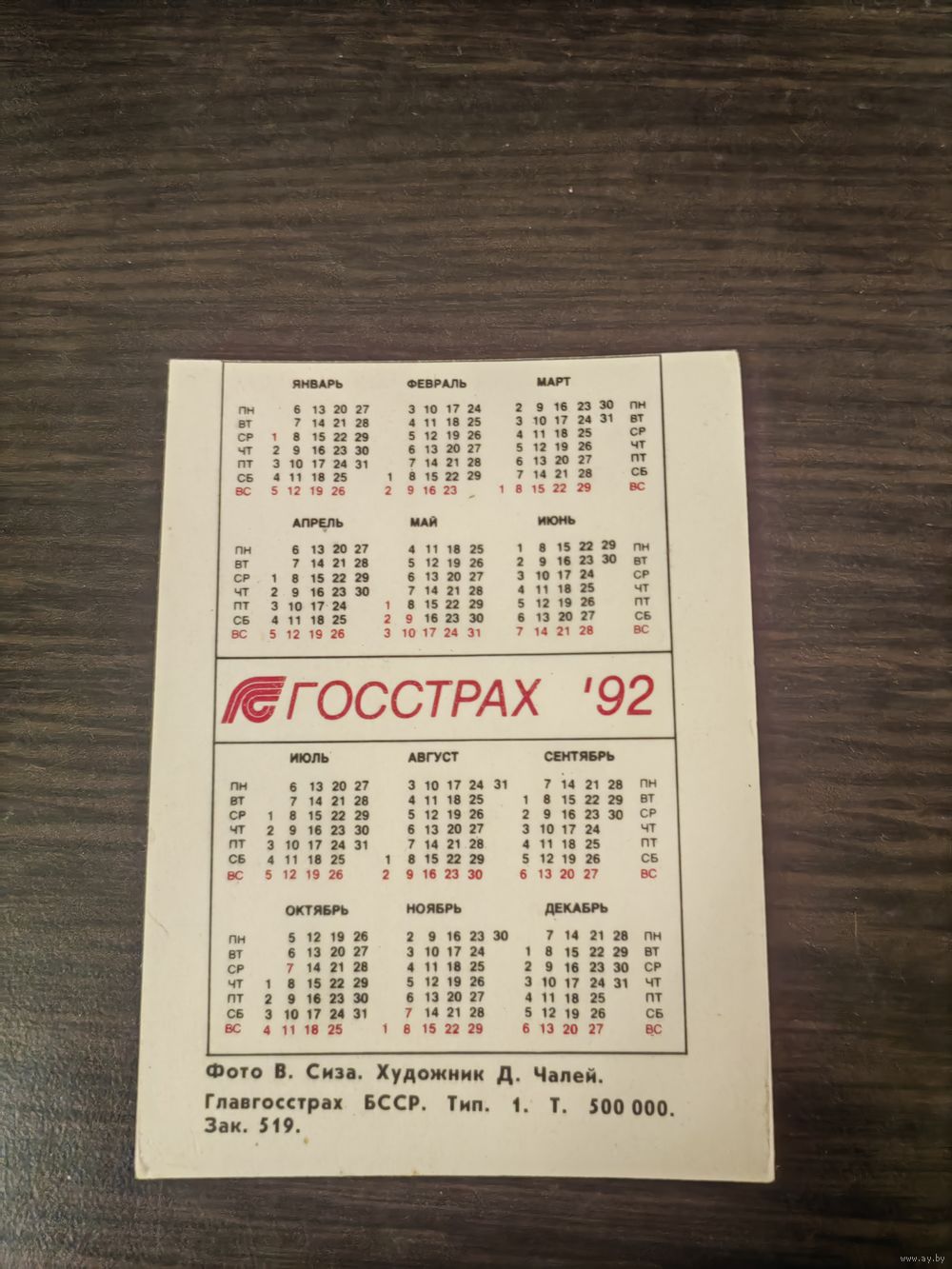 Календарик,страхование,1992