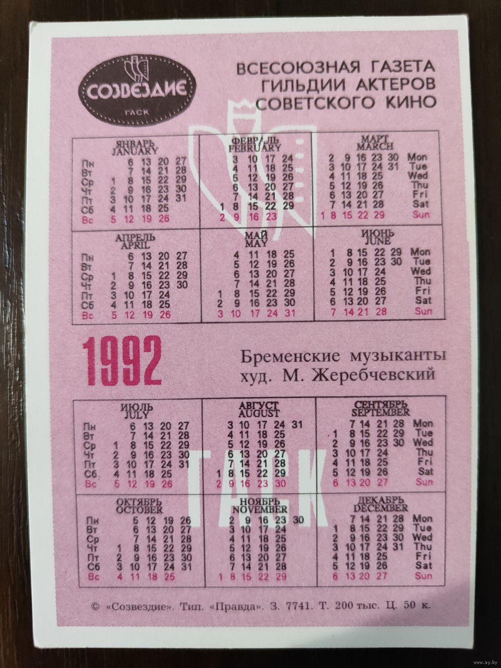 Календарик Всесоюзная газета гильдии актеров советского кино 1992г