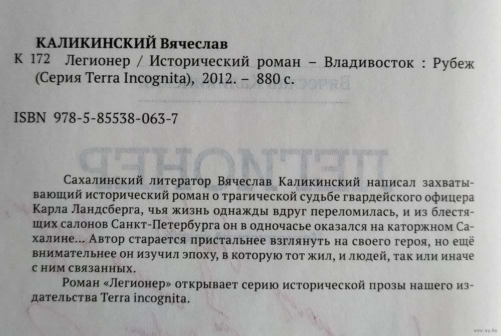 Сахалинский литератор Вячеслав Каликинский написал захватывающий исторический роман о трагической судьбе гвардейского офицера Карла Ландсберга, чья жизнь однажды вдруг переломилась, и из блестящих салонов Санкт-Петербурга он в одночасье оказался на каторжном Сахалине... Автор старается пристальнее взглянуть на своего героя, но ещё внимательнее он изучил эпоху, в которую тот жил, и людей, так или иначе с ним связанных. Роман «Легионер» открывает серию исторической прозы издательства «Terra Incognita».