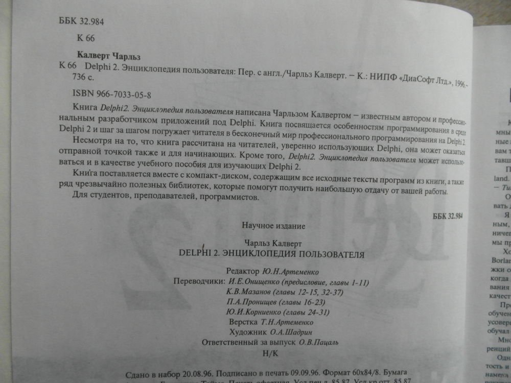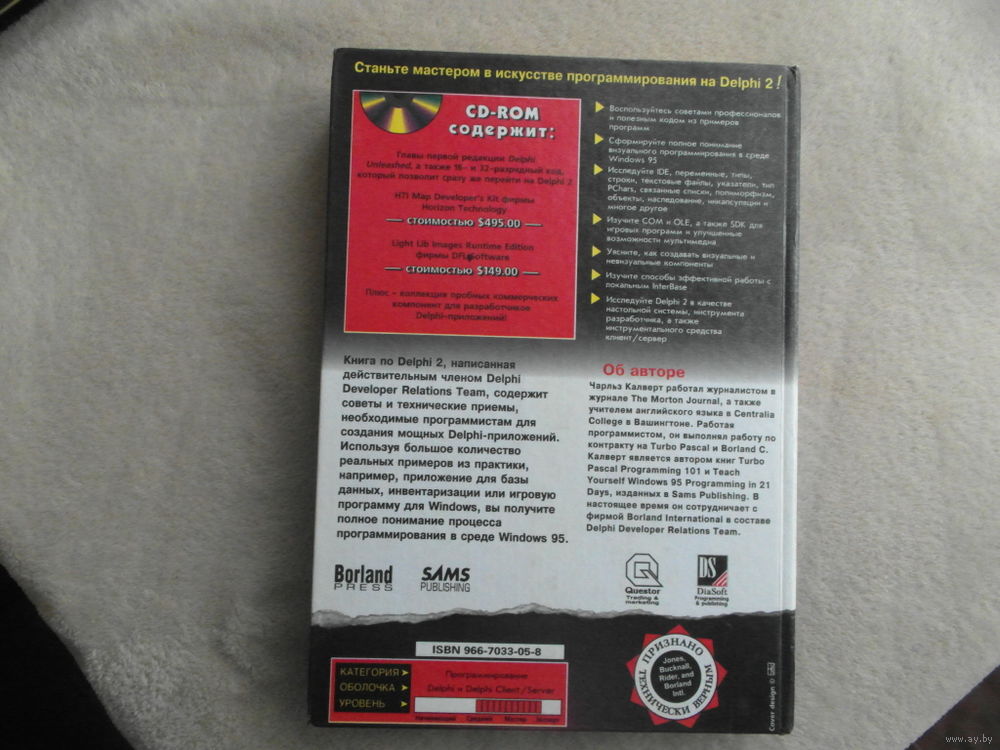 Книга Чарльза Калверта «Delphi 2. Энциклопедия пользователя», автор которой — профессиональный разработчик приложений под Delphi, ознакомит читателя с особенностями программирования в среде Delphi 2. Книга создана как для уверенных пользователей Delphi, так и для начинающих обучаться языку Delphi 2. Данное издание дополняется компакт-диском с исходными текстами программ из книги и полезной библиотекой, с помощью которой пользователь сможет повысить отдачу от своей работы. Книга предназначается студентам, преподавателям и программистам.