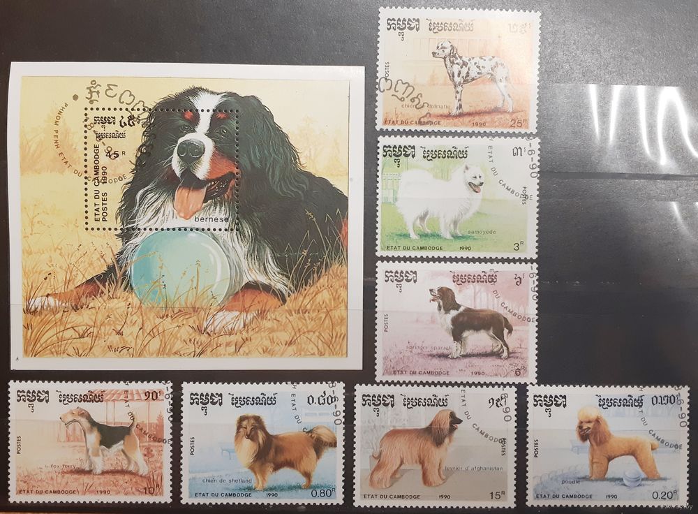 Камбоджа. 1990 год. Фауна. Собаки. Блок и 7 марок (800)