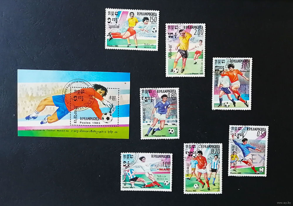 Камбоджа. Кампучия 1985 г. Чемпионат мира по футболу 1986 года. Мексика, полная серия из 7 марок + Блок #0117-С1P19