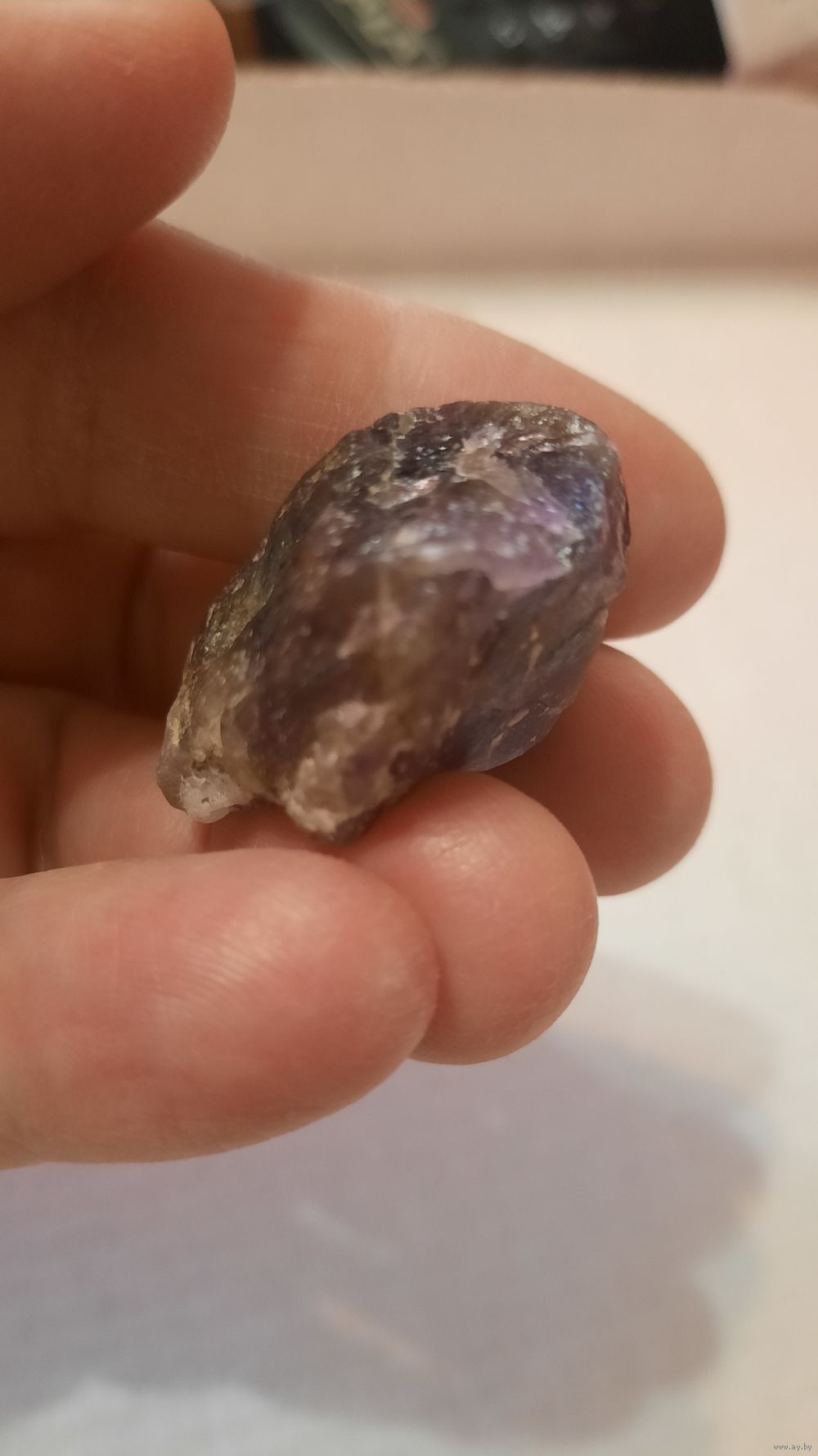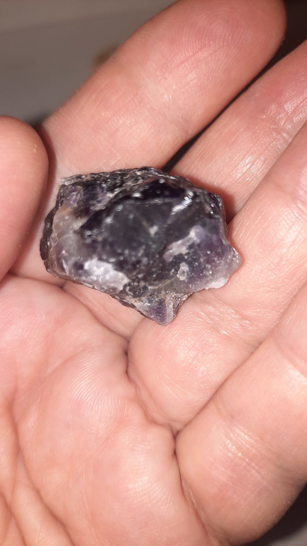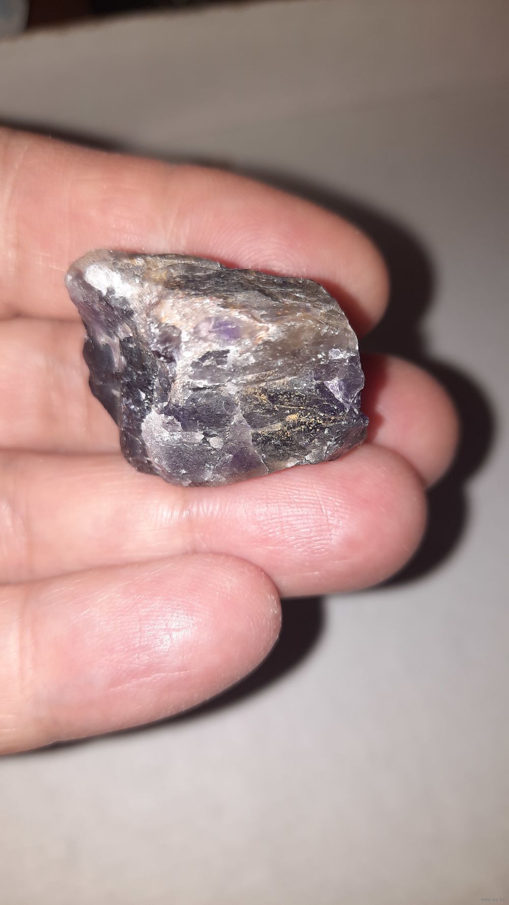 Фото сделаны со вспышкой и без. Хотелось передать сиреневый цвет. Возможно аметист находится на кварците серого цвета. Больше виден сиреневый цвет при просмотре на солнце.