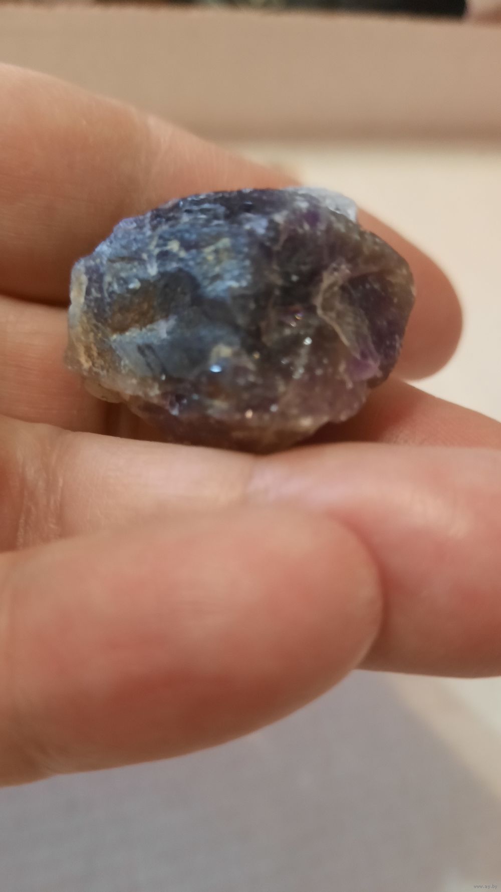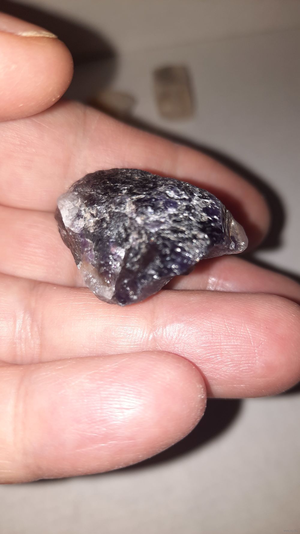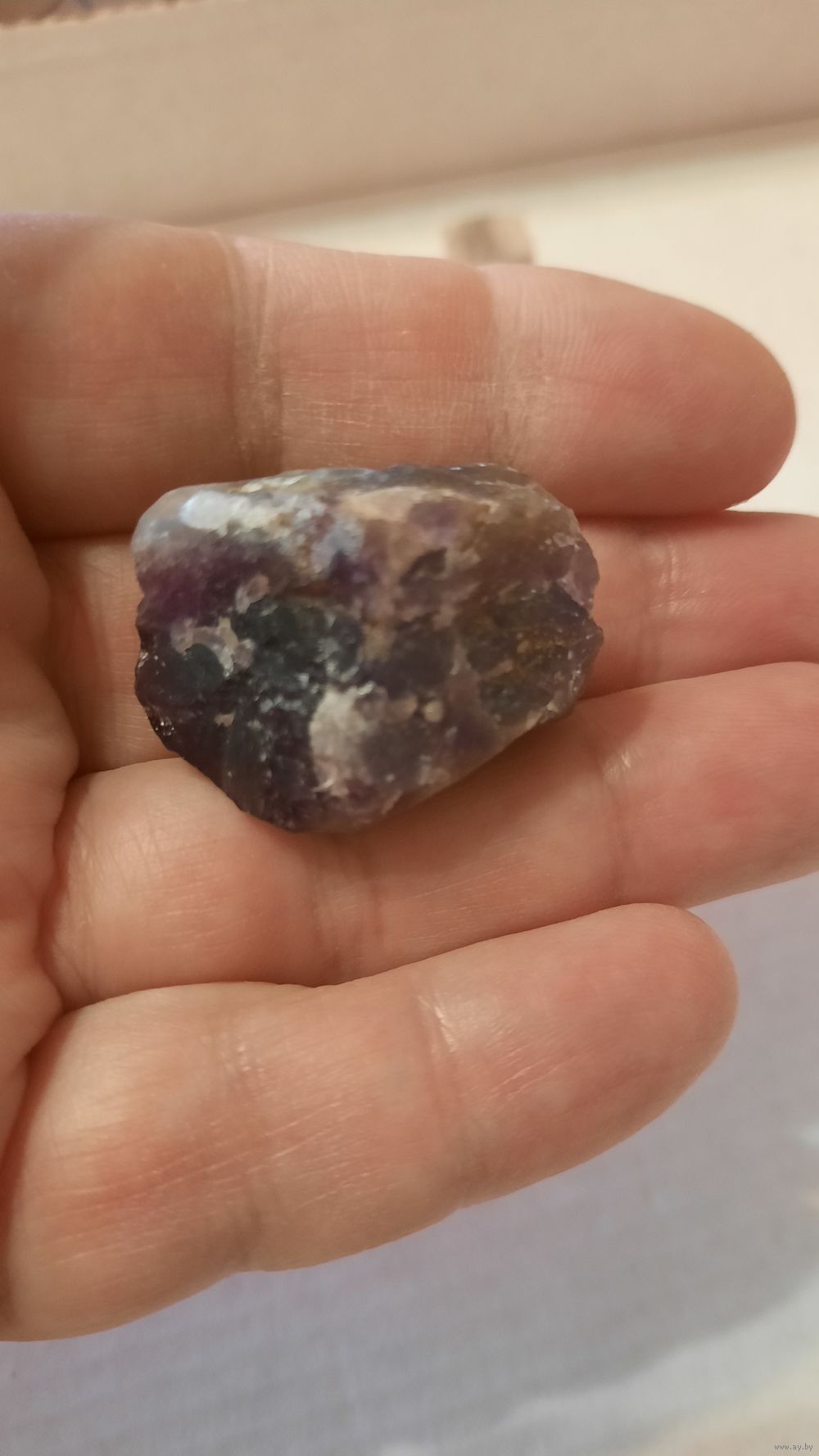 Фото сделаны со вспышкой и без. Хотелось передать сиреневый цвет. Возможно аметист находится на кварците серого цвета. Больше виден сиреневый цвет при просмотре на солнце.