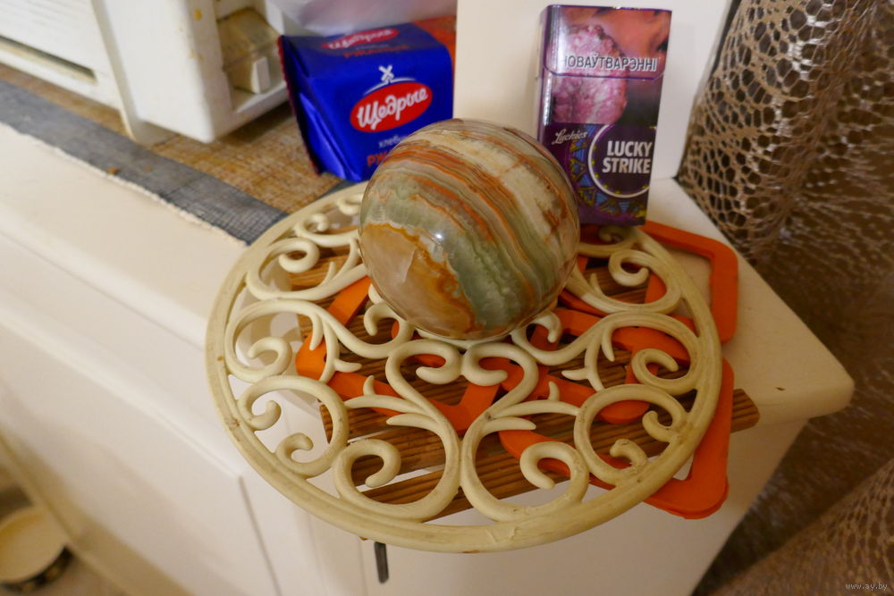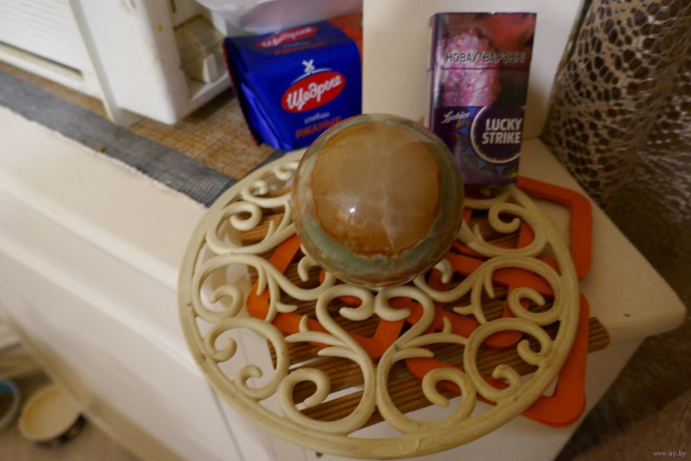 Каменный шар из оникса. Идеально круглый. Рядом сигаретная пачка для понимания высоты и размера.