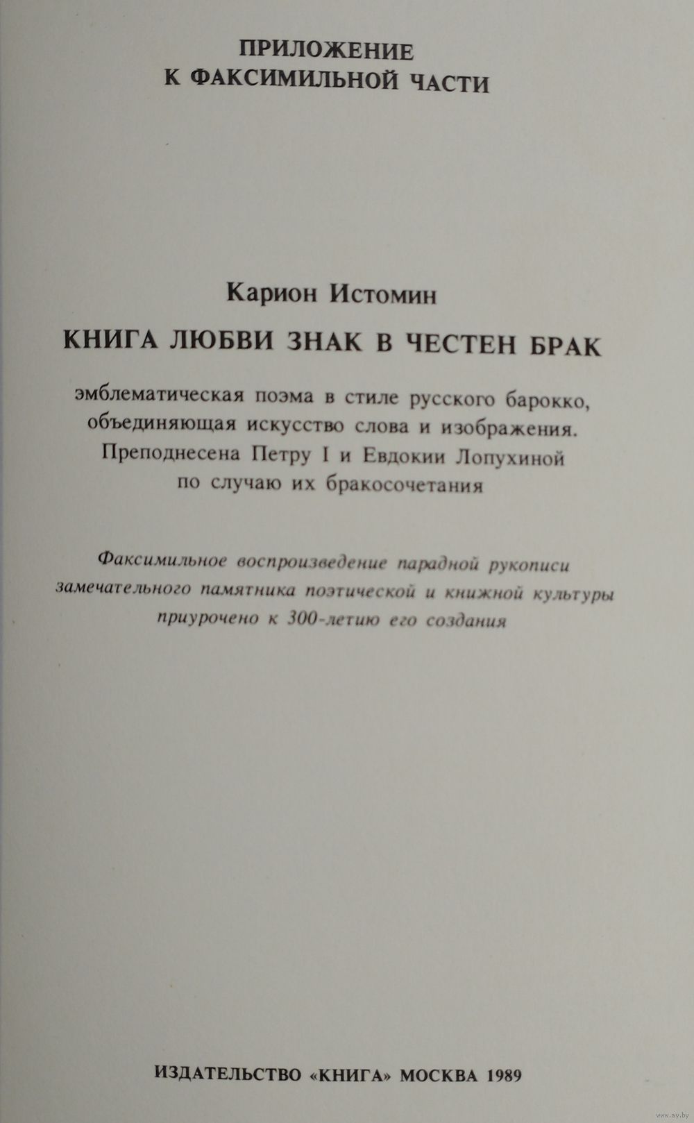 Большой энциклопедический формат. Ляссе. Тираж 12000 экз. 112 стр. "Книга любви знак в честен брак" - замечательный памятник поэтической и книжной культуры, эмблематическая поэма в стиле русского барокко, объединяющая искусство слова и изображения, свадебное поздравление молодым. Преподнесена Петру I и Евдокии Лопухиной по случаю их бракосочетания (30 января 1689). В настоящем издании дано факсимильное воспроизведение подносного экземпляра рукописи. Публикация "Книги любви знак…" сопровождается удобным для чтения текстом.