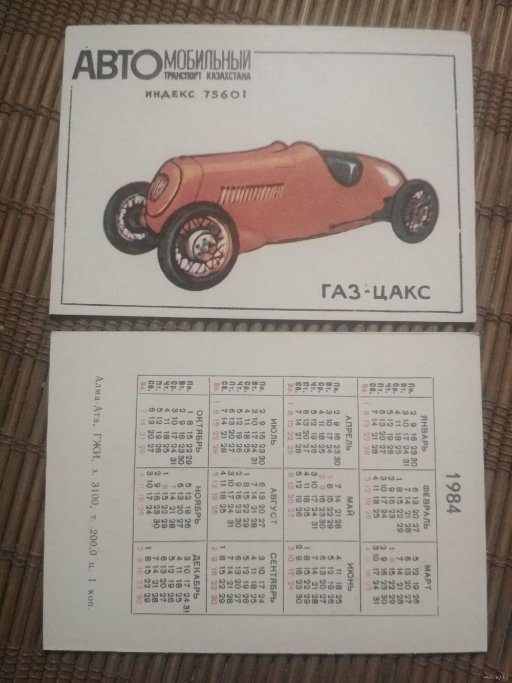 Карманный календарик. 1984 год. Автомобильный транспорт Казахстана. ГАЗ-ЦАКС