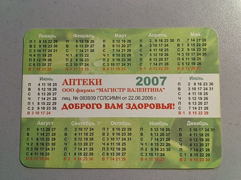Карманный календарик. Аптеки. 2007 год