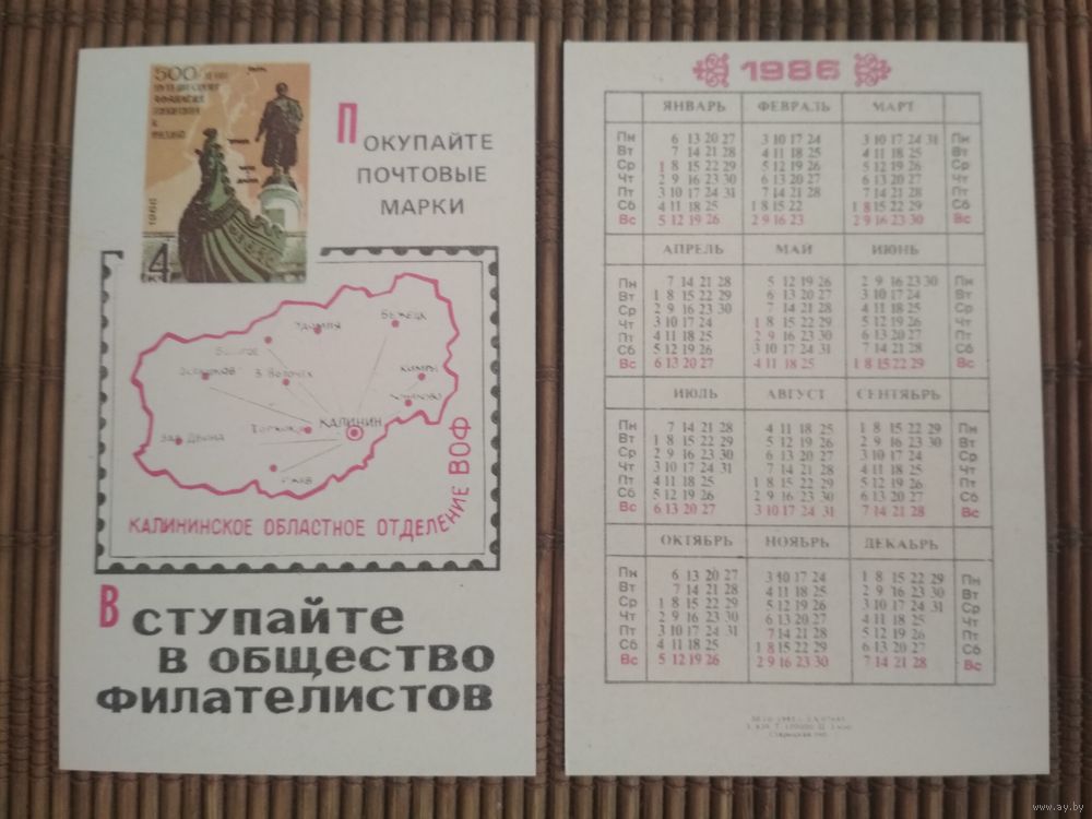 Карманный календарик. Филателия. 1986 год