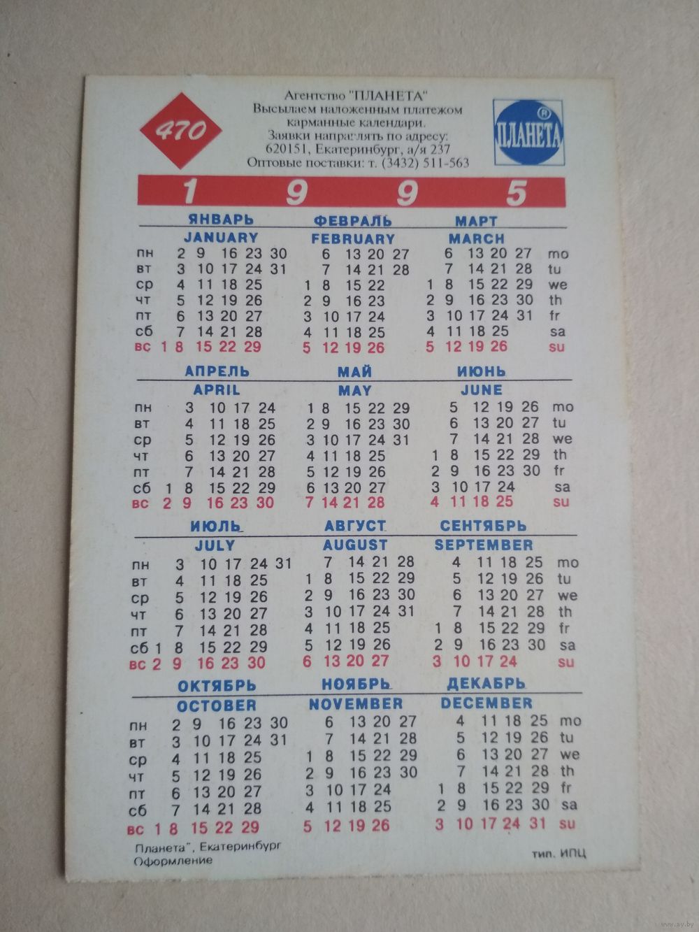 Карманный календарик.Кошки.1995 год