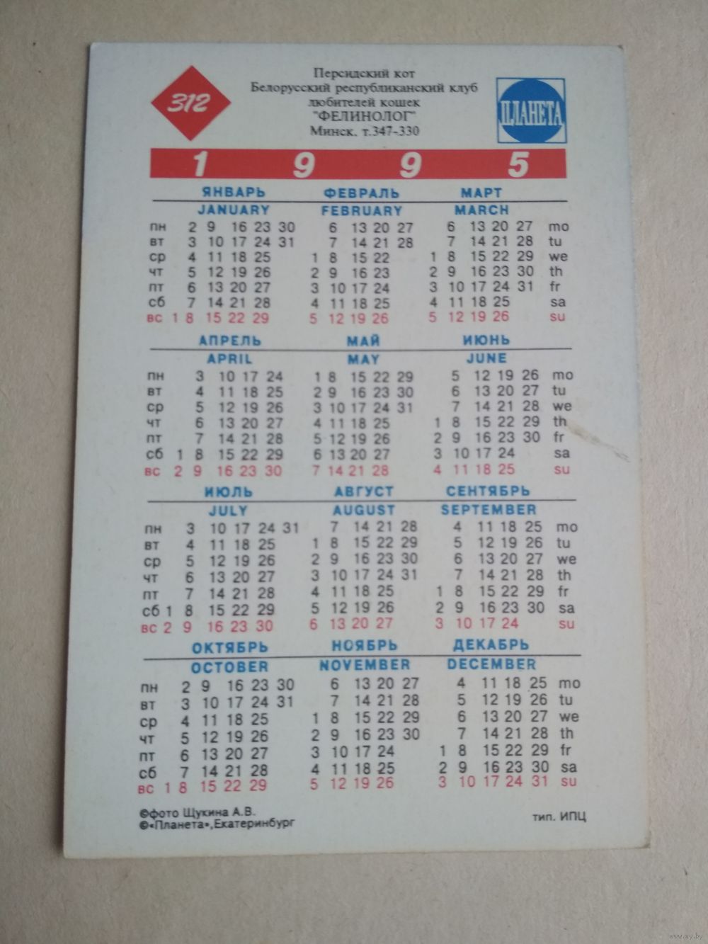 Карманный календарик.Кошки.1995 год