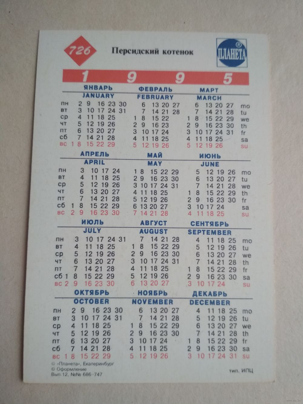 Карманный календарик.Кошки.1995 год