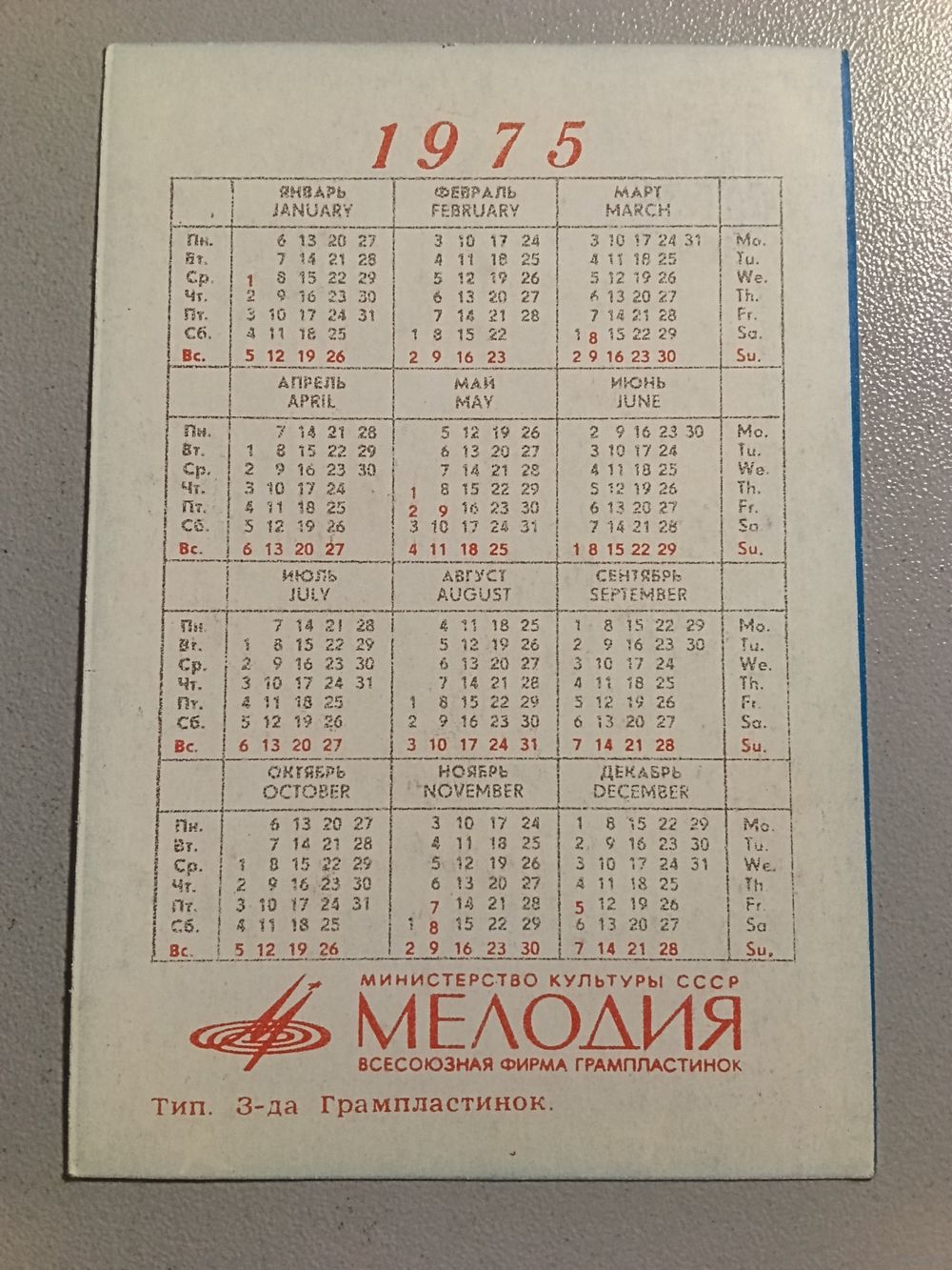 Карманный календарик. Мелодия. С новым годом.1975 год