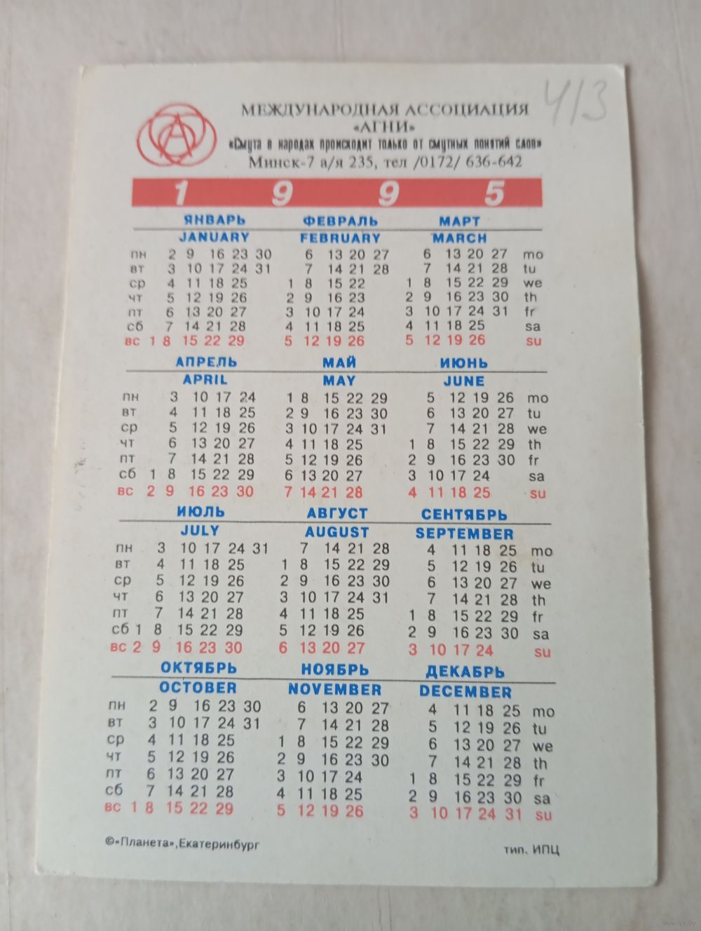 Карманный календарик. Планета. Екатеринбург. 1996 год