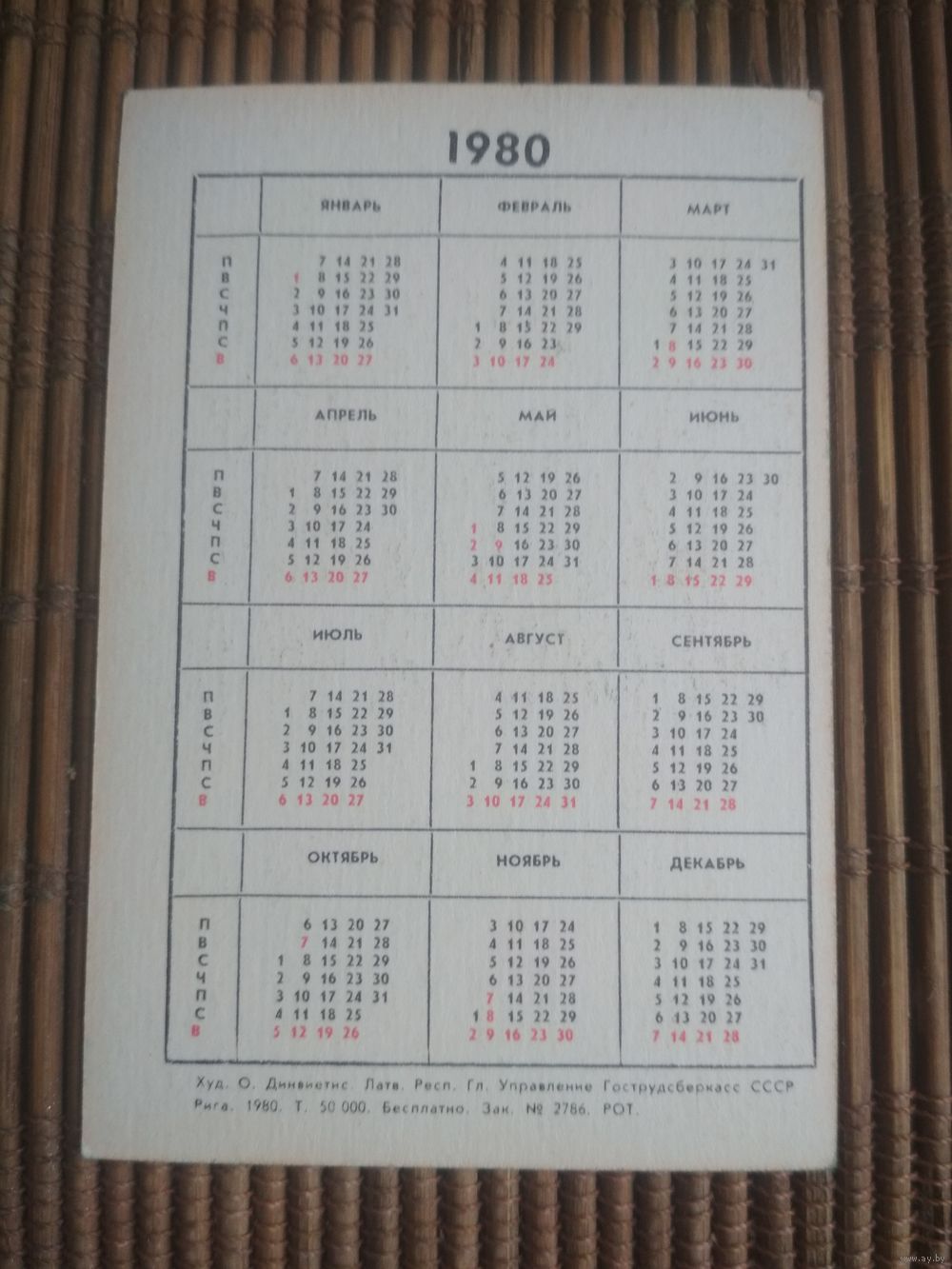 Карманный календарик . Сберкассы. 1980 год