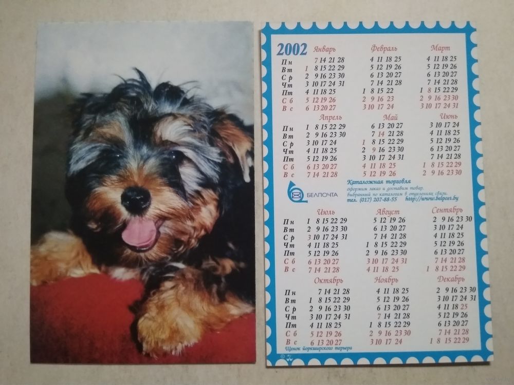 Карманный календарик . Щенок йоркширского терьера. Белпочта. 2002 год