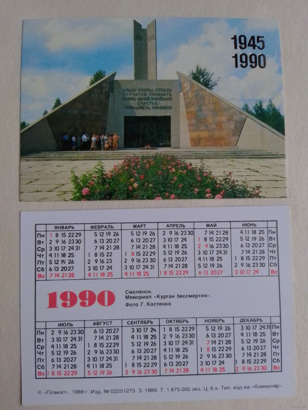 Карманный календарик. Смоленск. Курган бессмертия. 1990 год