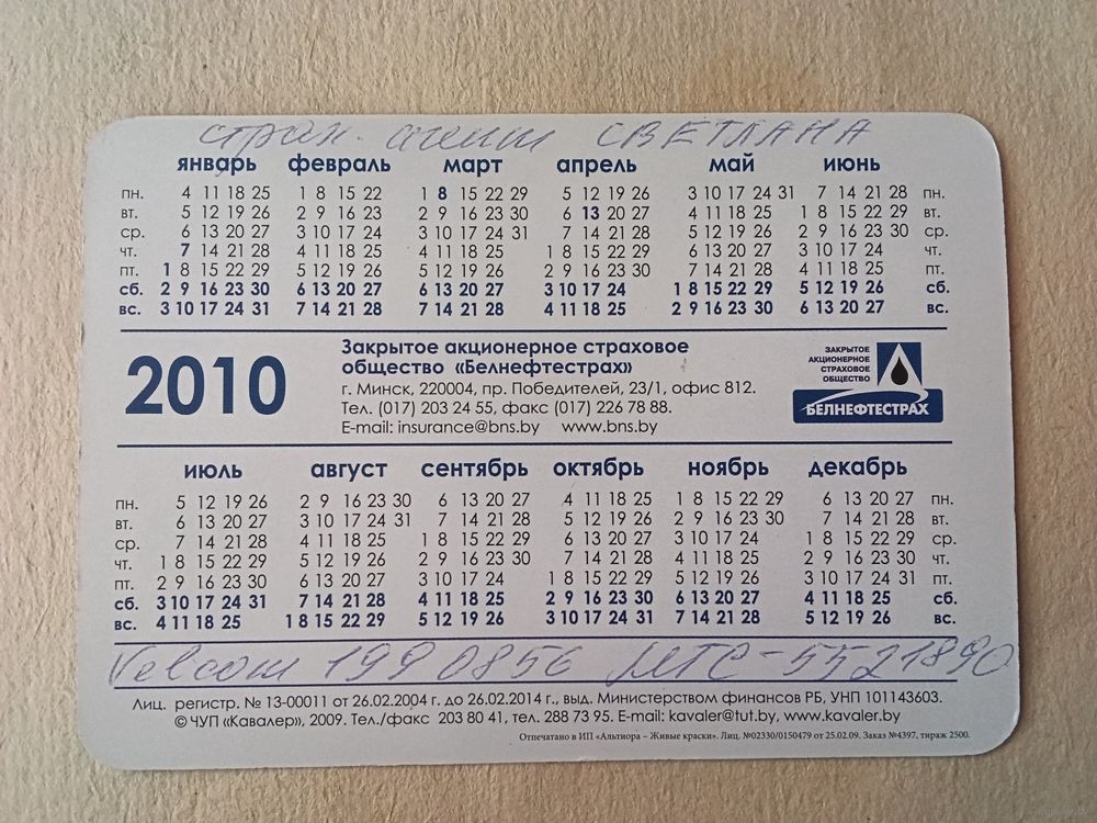 Карманный календарик. Страхование. 2010 год
