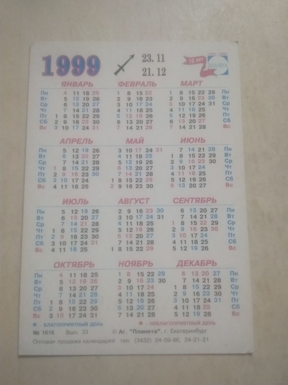 Карманный календарик. Знаки зодиака. Стрелец. 1999 год