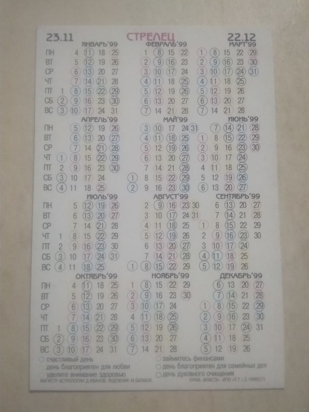 Карманный календарик. Знаки зодиака. Стрелец. 1999 год