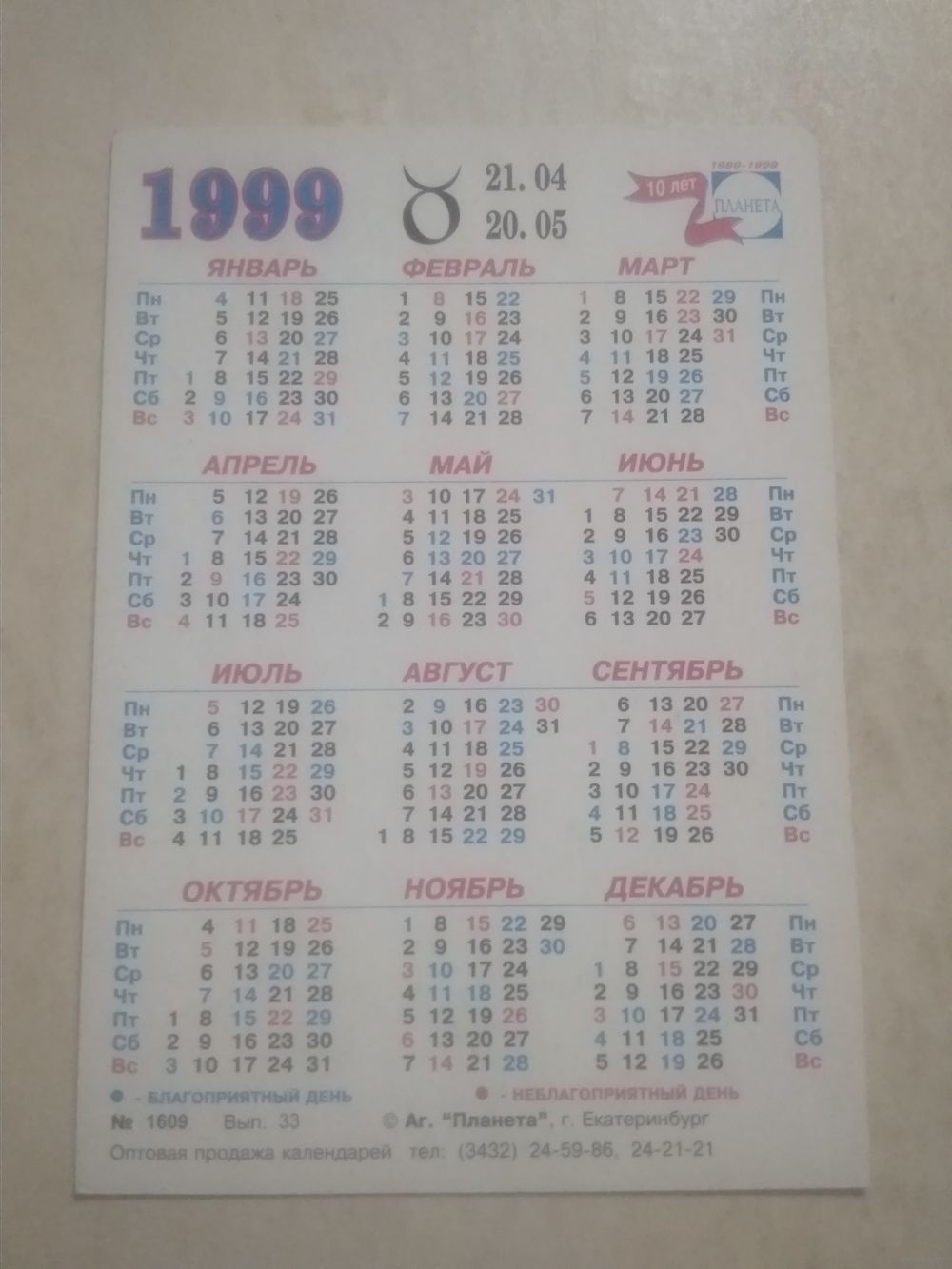 Карманный календарик. Знаки зодиака. Телец. 1999 год