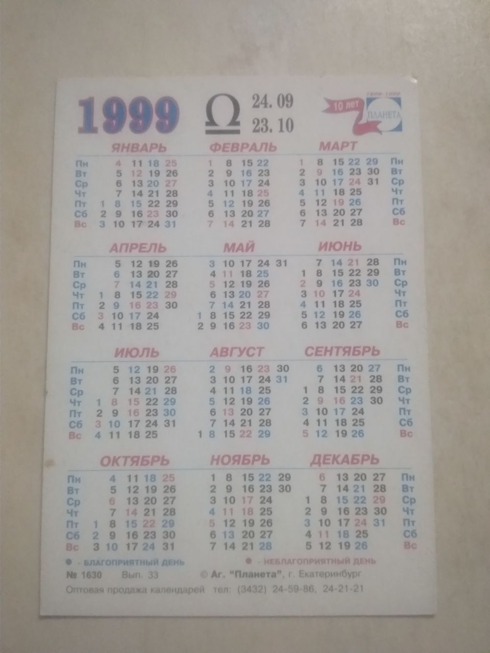 Карманный календарик. Знаки зодиака. Весы. 1999 год