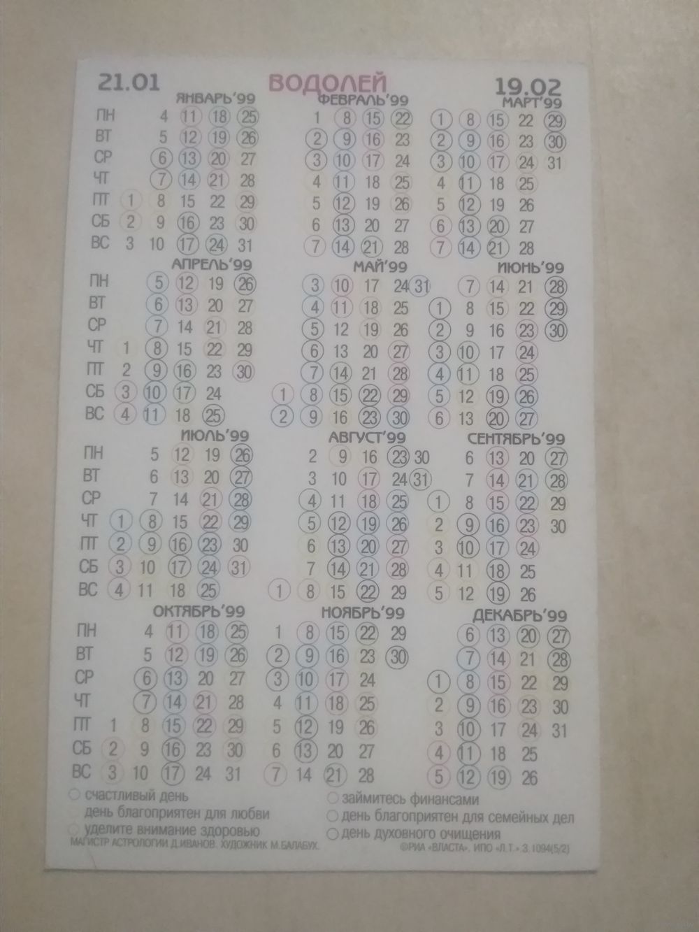 Карманный календарик. Знаки зодиака. Водолей. 1999 год