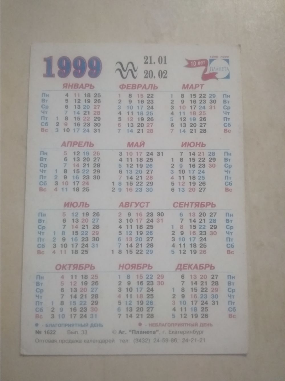 Карманный календарик. Знаки зодиака. Водолей. 1999 год