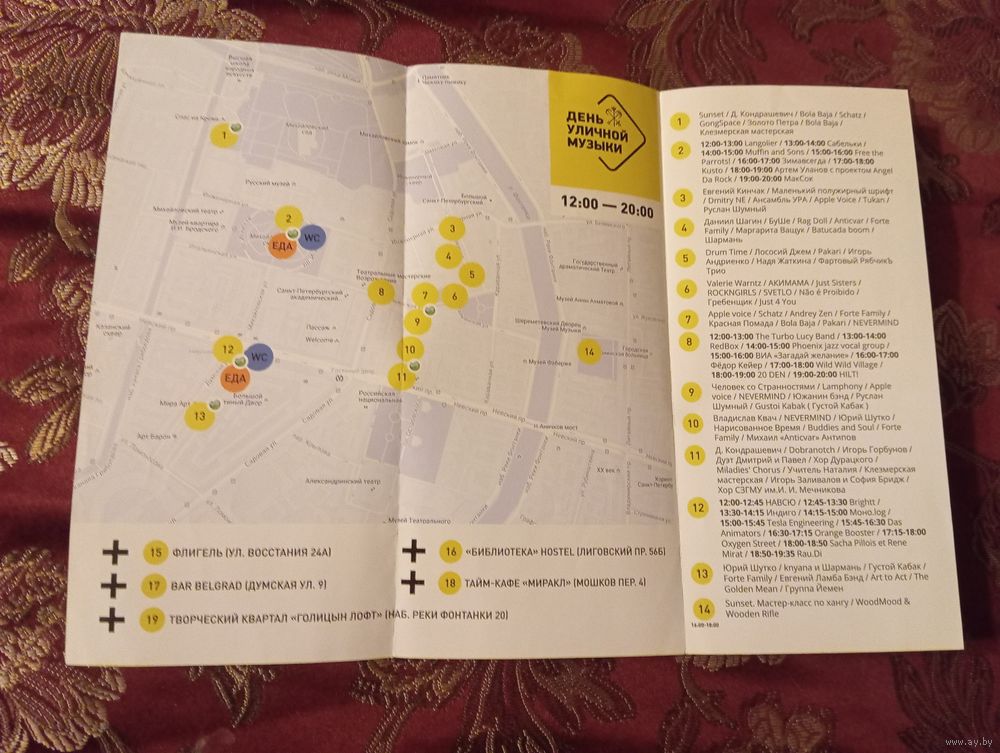 На изображении представлена карта и расписание мероприятий в рамках «Дня уличной музыки» в Санкт-Петербурге.