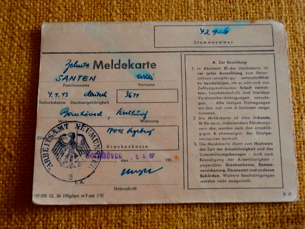 Карта записей биржи труда о предоставлении помощи безработному 1956, 1957 гг. Германия 2 штуки.