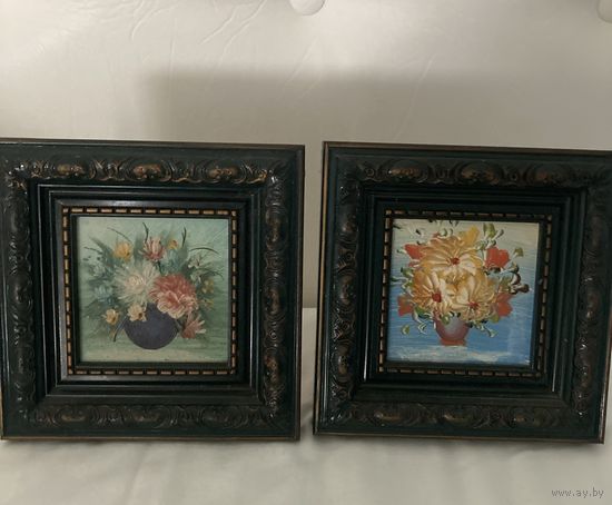 Красивые парные картинки14 см х 14 см, рама зеленый пластик , выглядит как дерево, масло, картон , цена за 2 картинки