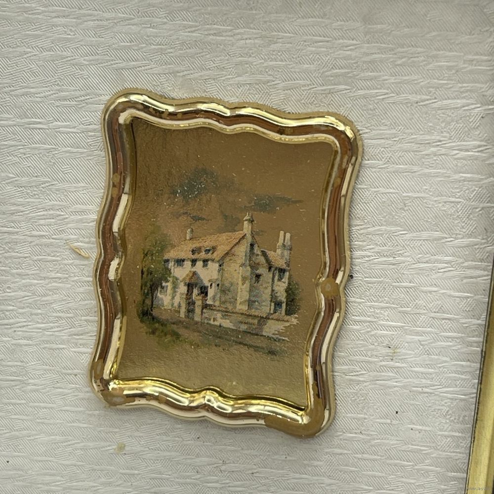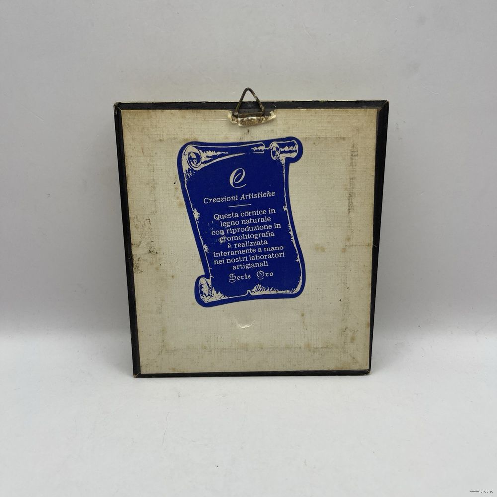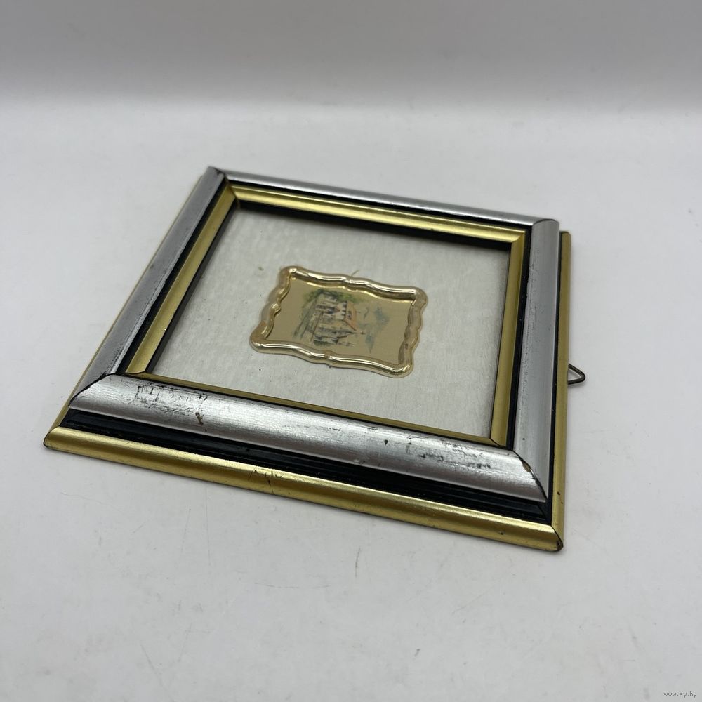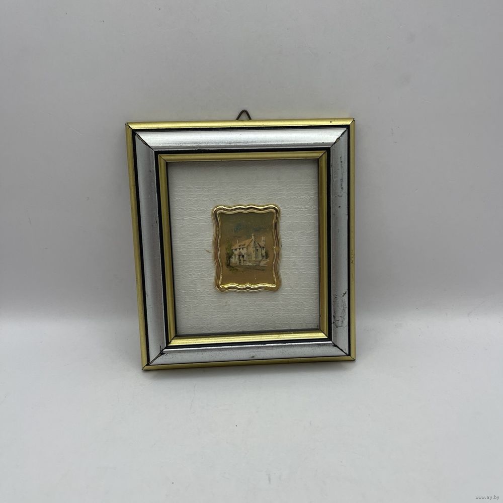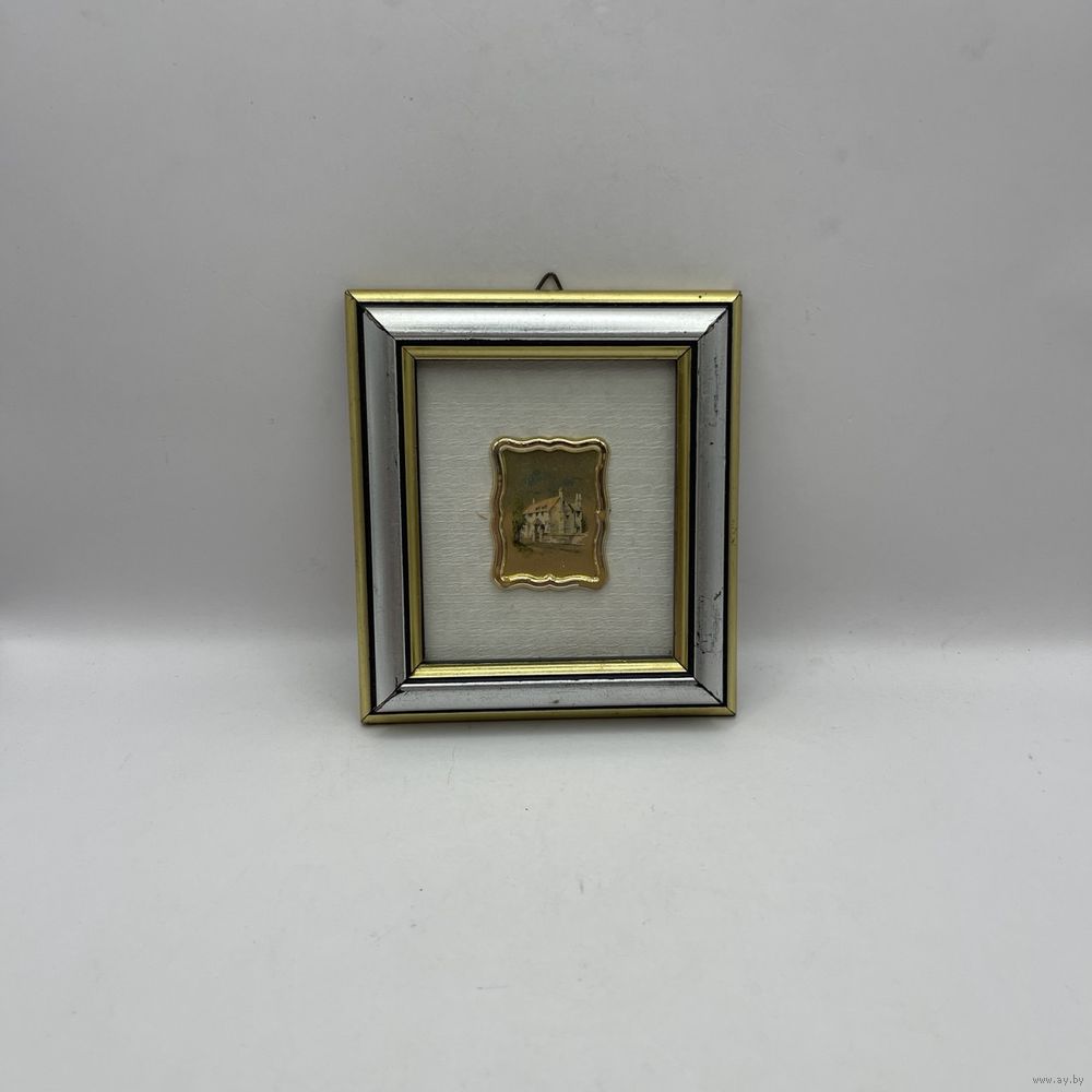 Винтажная миниатюрная картина-хромолитография ручной работы, итальянский деревенский пейзаж на золотой пластине. В деревянной раме ручной работы, под стеклом. Италия. 1970-е г.г. Сертификат. Размер 11 х 12 см. С подвесом. Потертости на раме (см. фото).