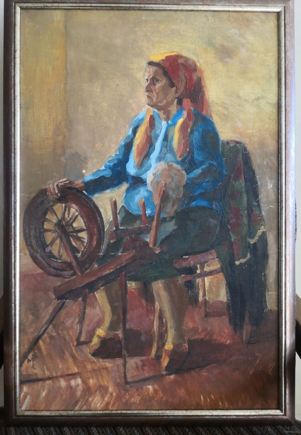 Картина.. худ. Волканов А. Женщина у старинного станка для пряжи..размер.75*51 см. холст. масло.