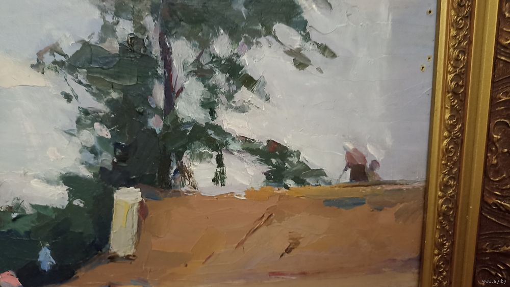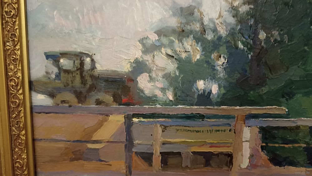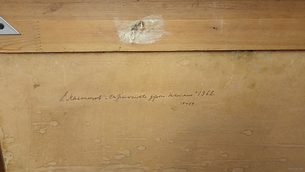 Карина без дефектов, размер 85 на 55 см. Строительство дороги, новый мост. 1962 год. ДВП, масло