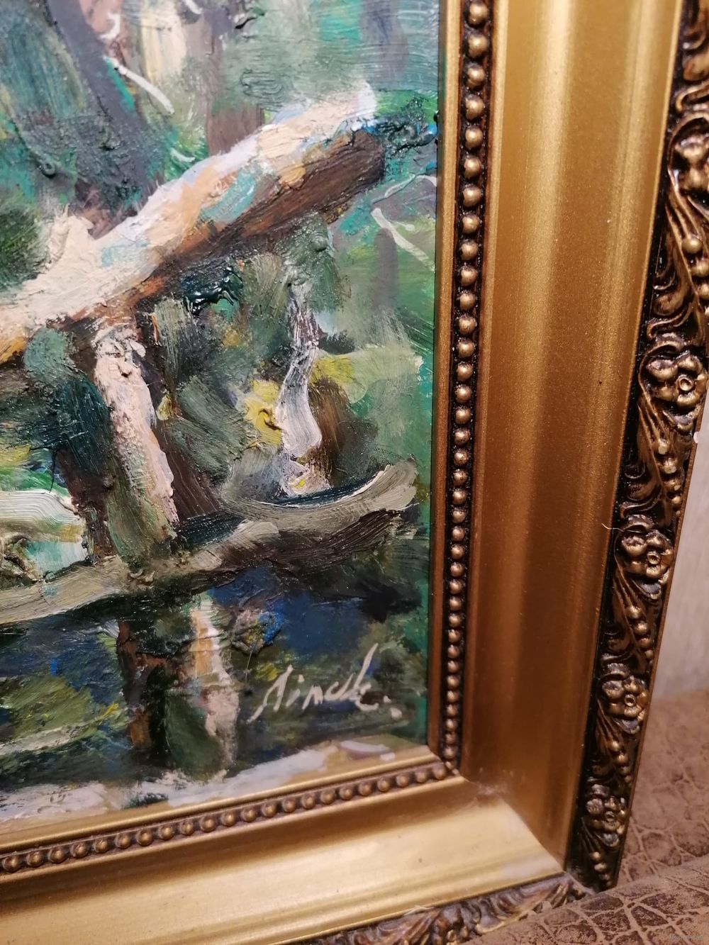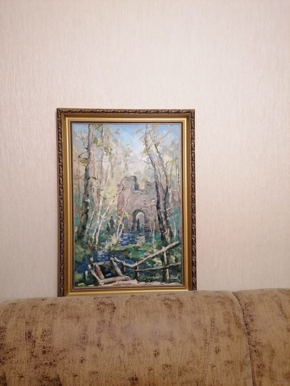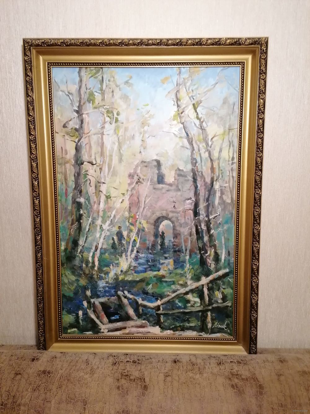 Картина белорусского художника - реставратора Алексея Липского выполнена в технике масляной живописи. Есть автограф автора в правом нижнем углу. На картине изображены руины старого здания в лесу. Размеры картины с рамкой: высота 69 см, ширина 49 см.
