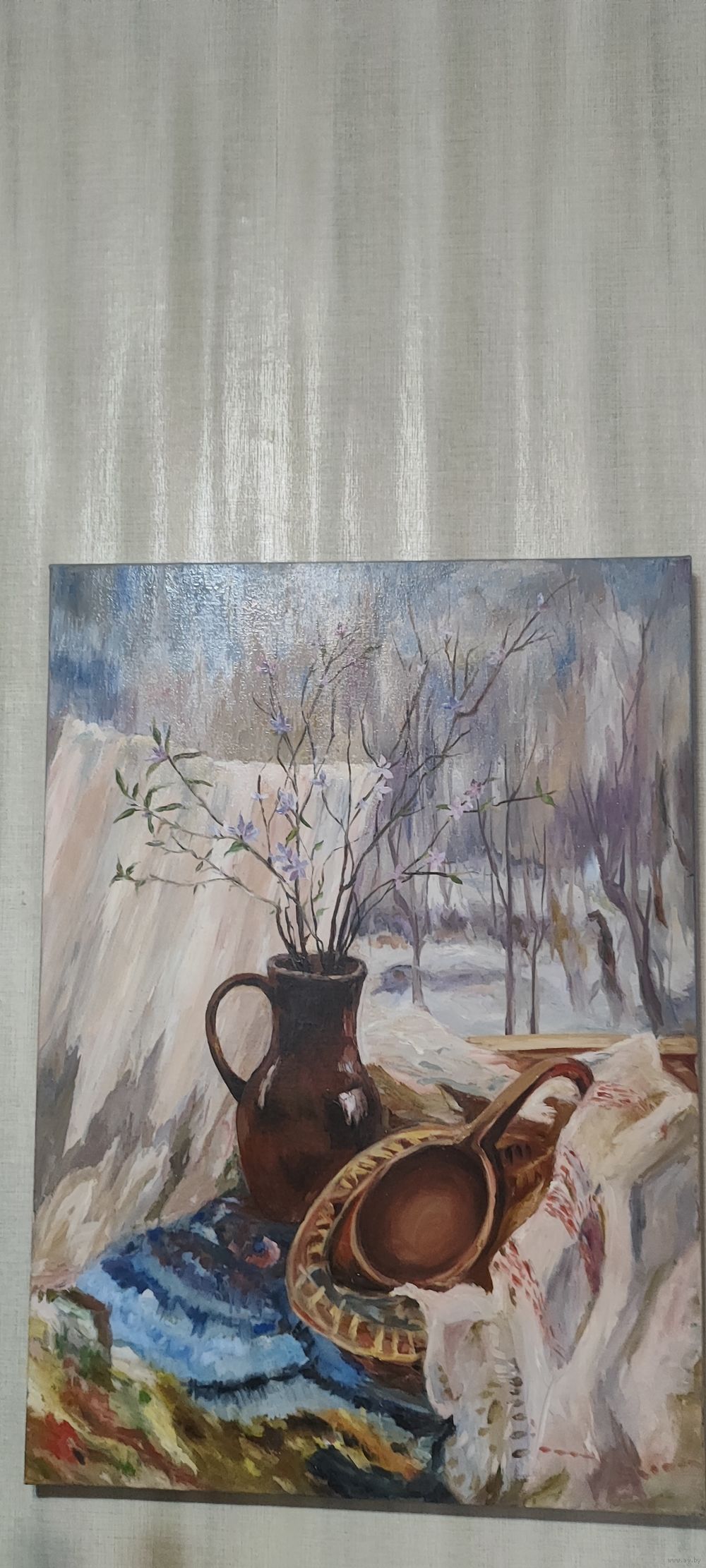 Центральное место в композиции занимает керамический кувшин с ветвями цветущей миндаля, символизирующими надежду и возрождение. Рядом с ним — традиционная глиняная посуда, укрытая вышитой скатертью, что добавляет сцене уют и домашнюю атмосферу. На заднем плане — пейзаж, где снежные поля и голые деревья словно слушают "напевы" весны, ожидая своего часа.